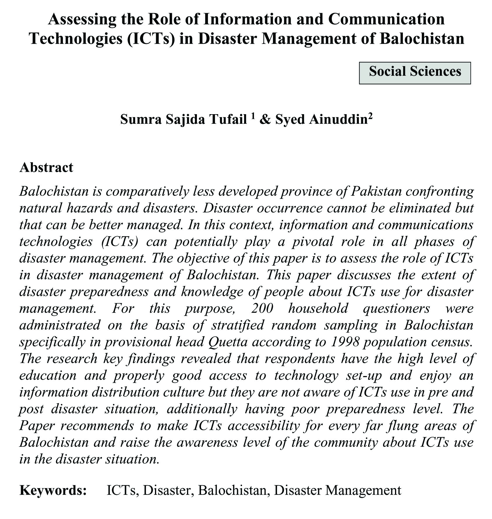 Assessing the Role of Information and Communication Technologies (ICTs) in Disaster Management of Balochistan (abstract)