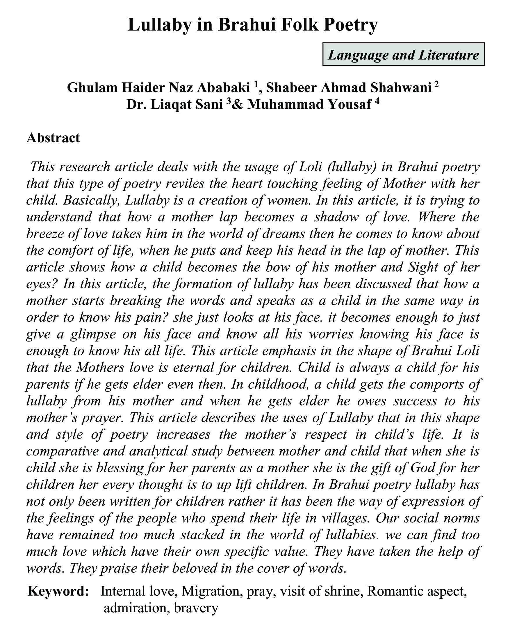 Ghulam Haider Naz Ababaki, Shabeer Ahmad Shahwani, Dr. Liaqat Sani, Muhammad Yousaf pp.115-128 |
