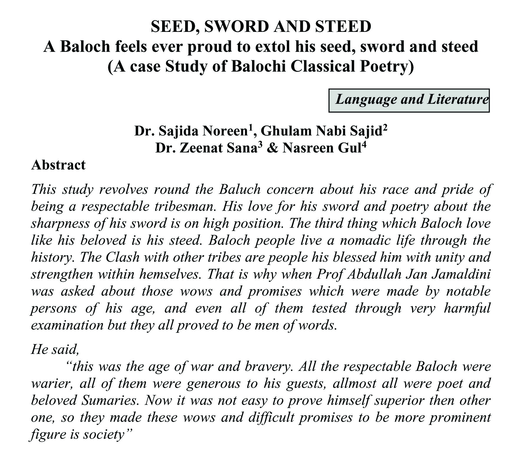 SEED, SWORD AND STEED A Baloch feels ever proud to extol his seed, sword and steed (A case Study of Balochi Classical Poetry) (abstract)