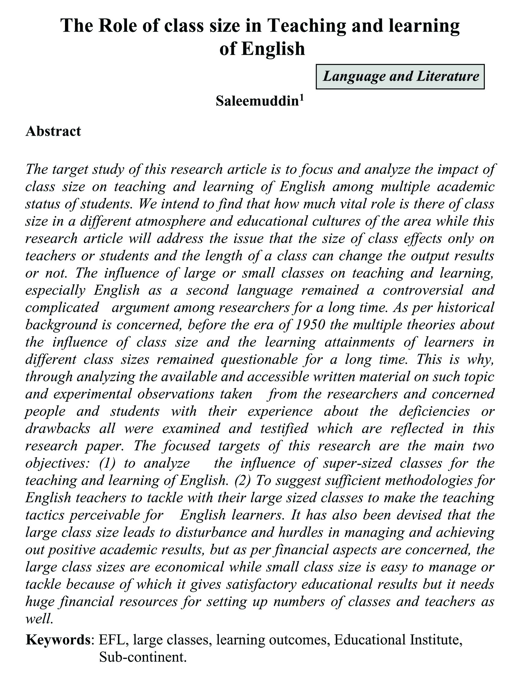 The Role of class size in Teaching and learning of English (abstract)