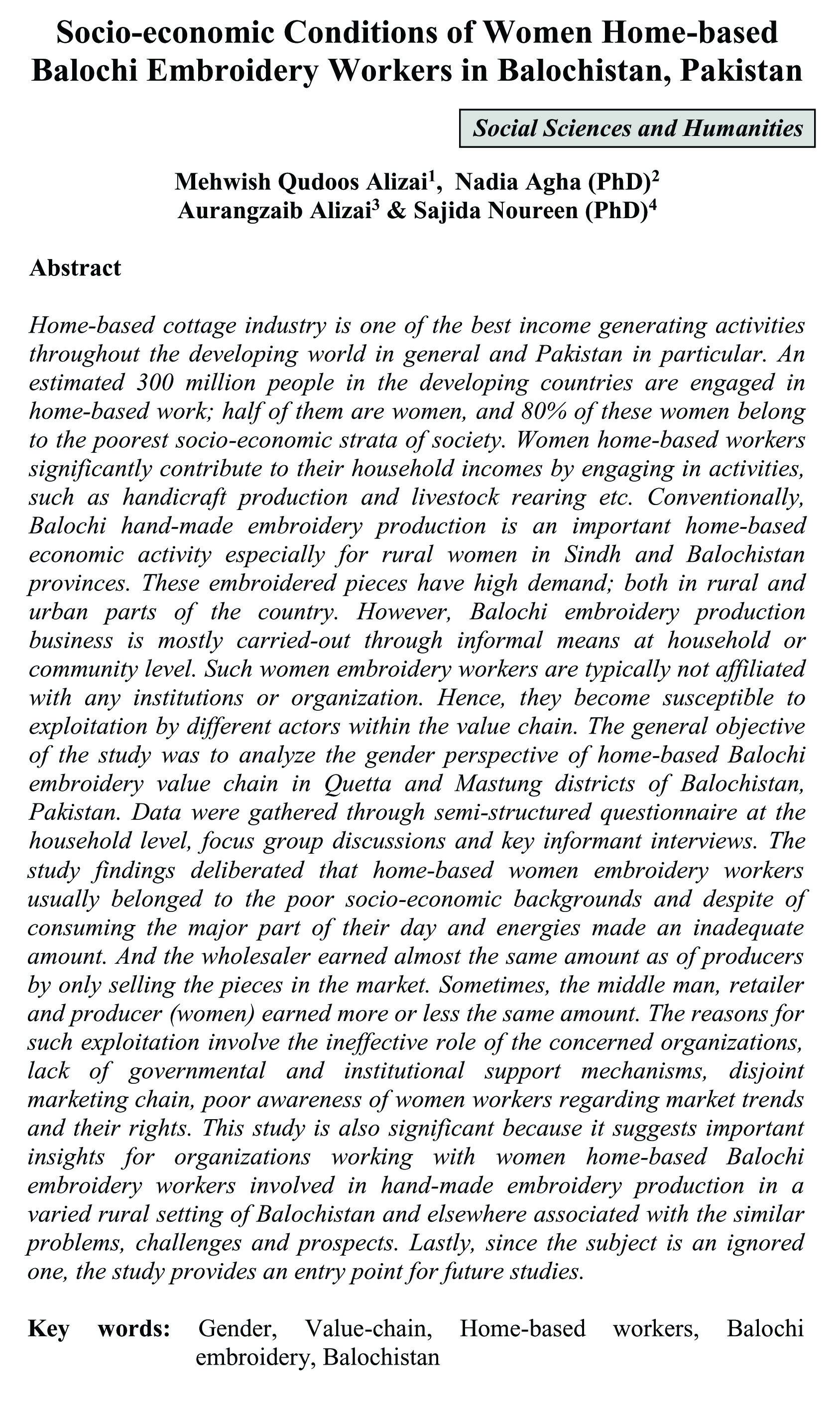 Socio-economic Conditions of Women Home-based Balochi Embroidery Workers in Balochistan, Pakistan (abstract)