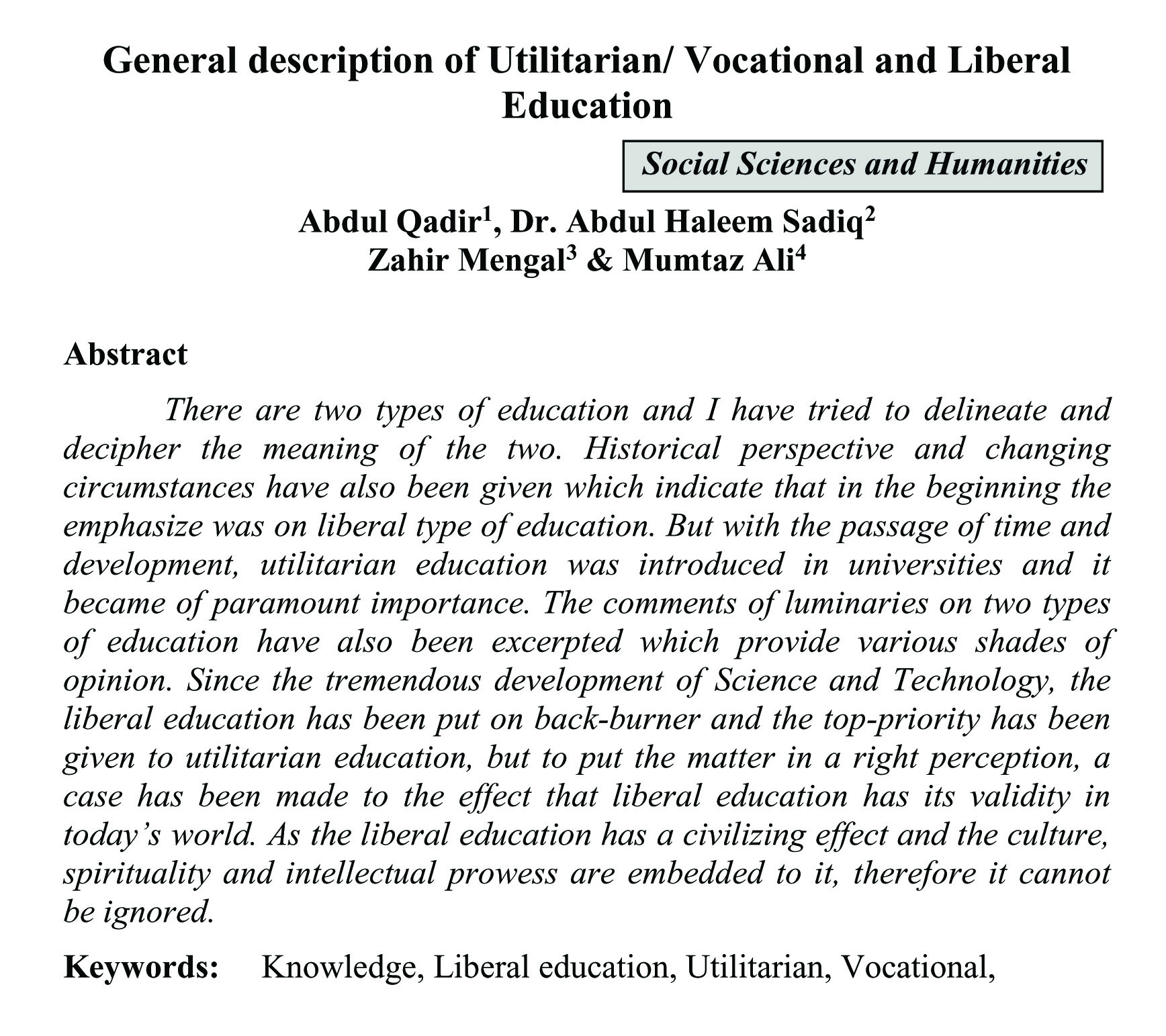 General description of Utilitarian/ Vocational and Liberal Education (abstract)