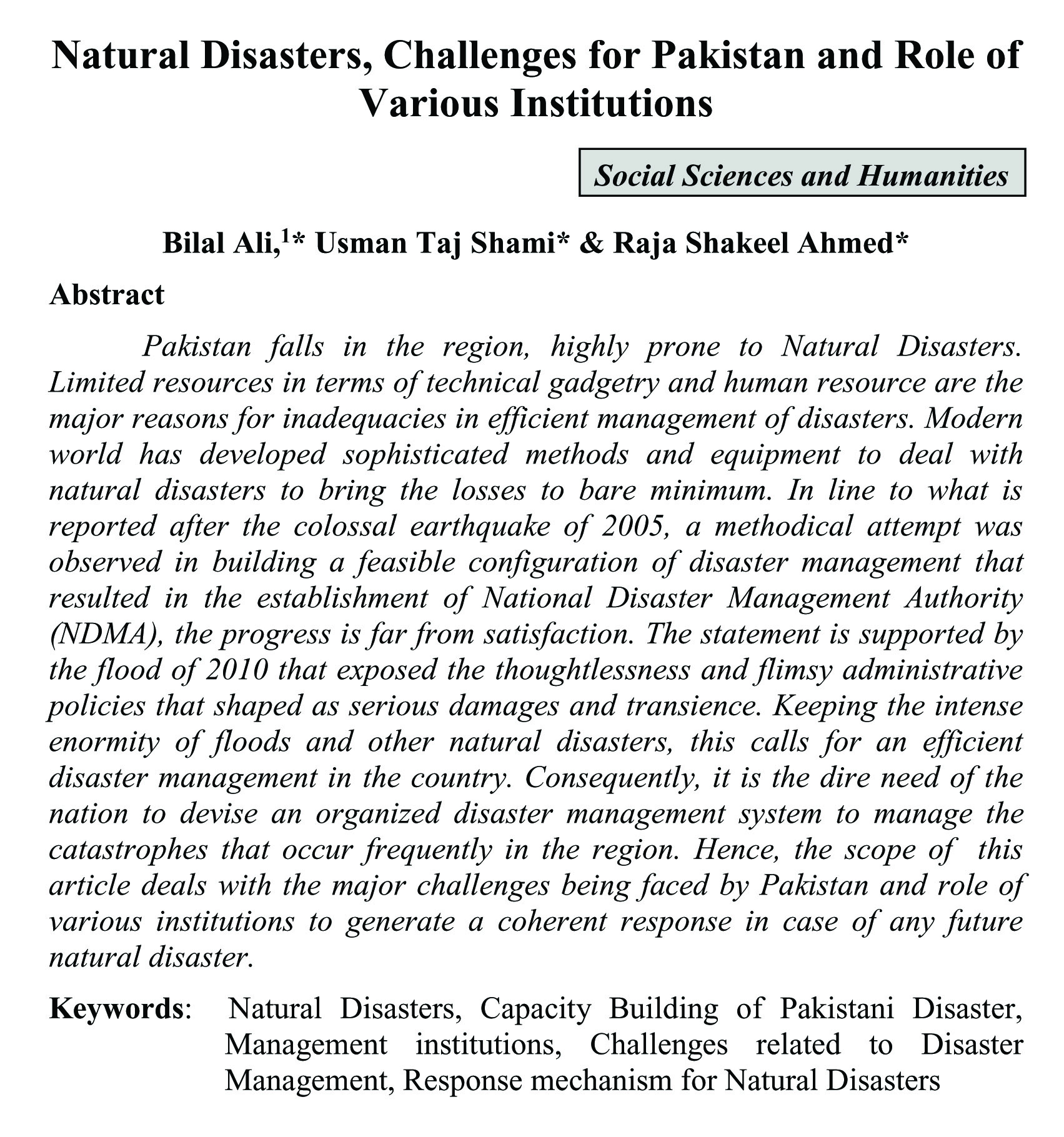 Natural Disasters, Challenges for Pakistan and Role of Various Institutions (abstract)