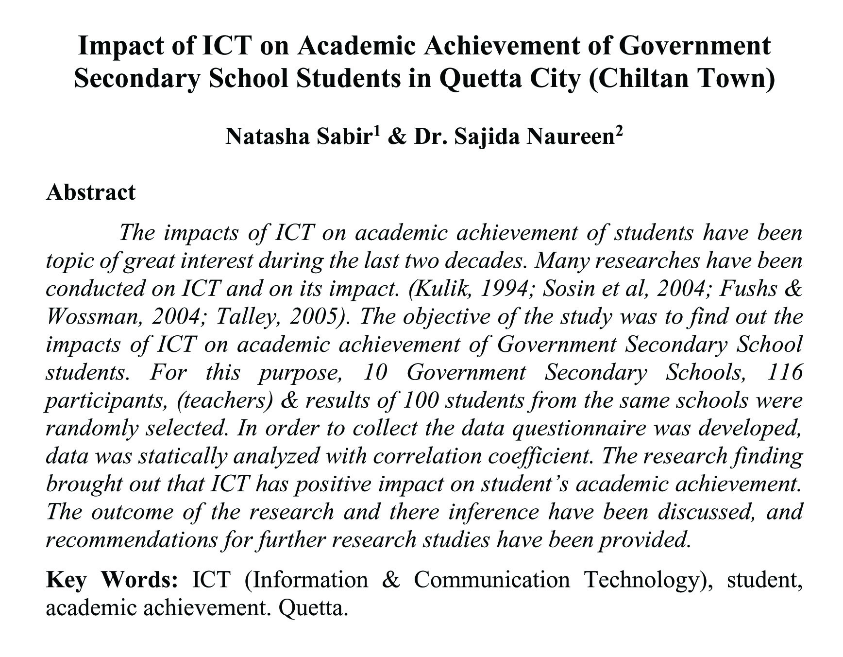 Impact of ICT on Academic Achievement of Government Secondary School Students in Quetta City (Chiltan Town) (abstract)