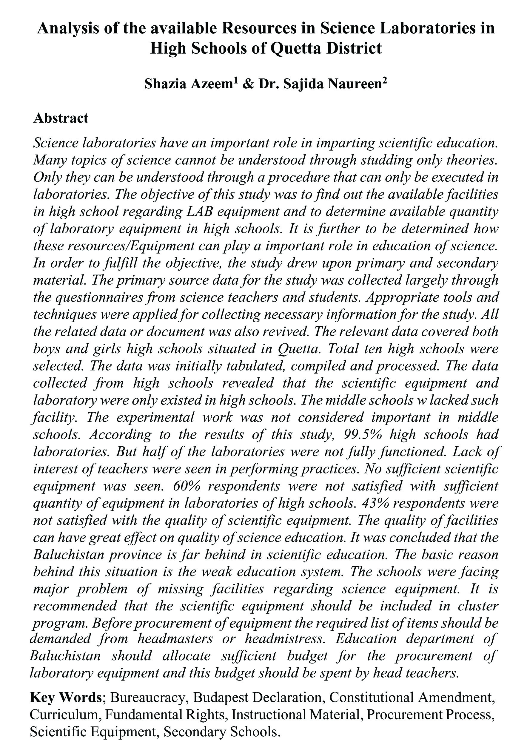 Analysis of the available Resources in Science Laboratories in High Schools of Quetta District (abstract)