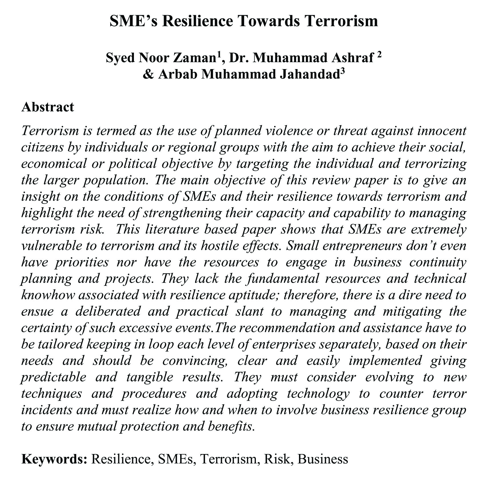 SME's Resilience Towards Terrorism (abstract)