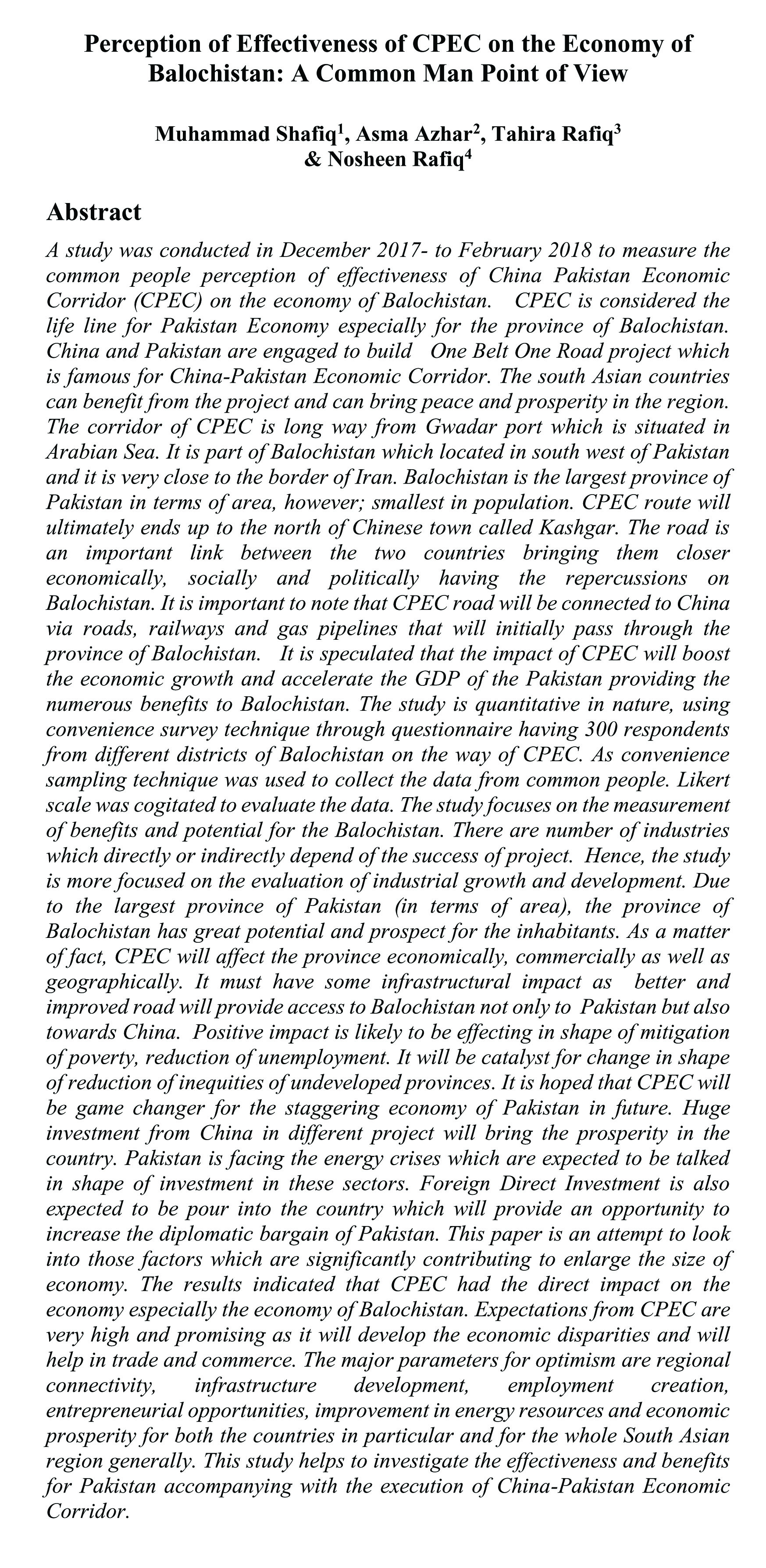 Perception of Effectiveness of CPEC on the Economy of Balochistan: A Common Man Point of View (abstract)