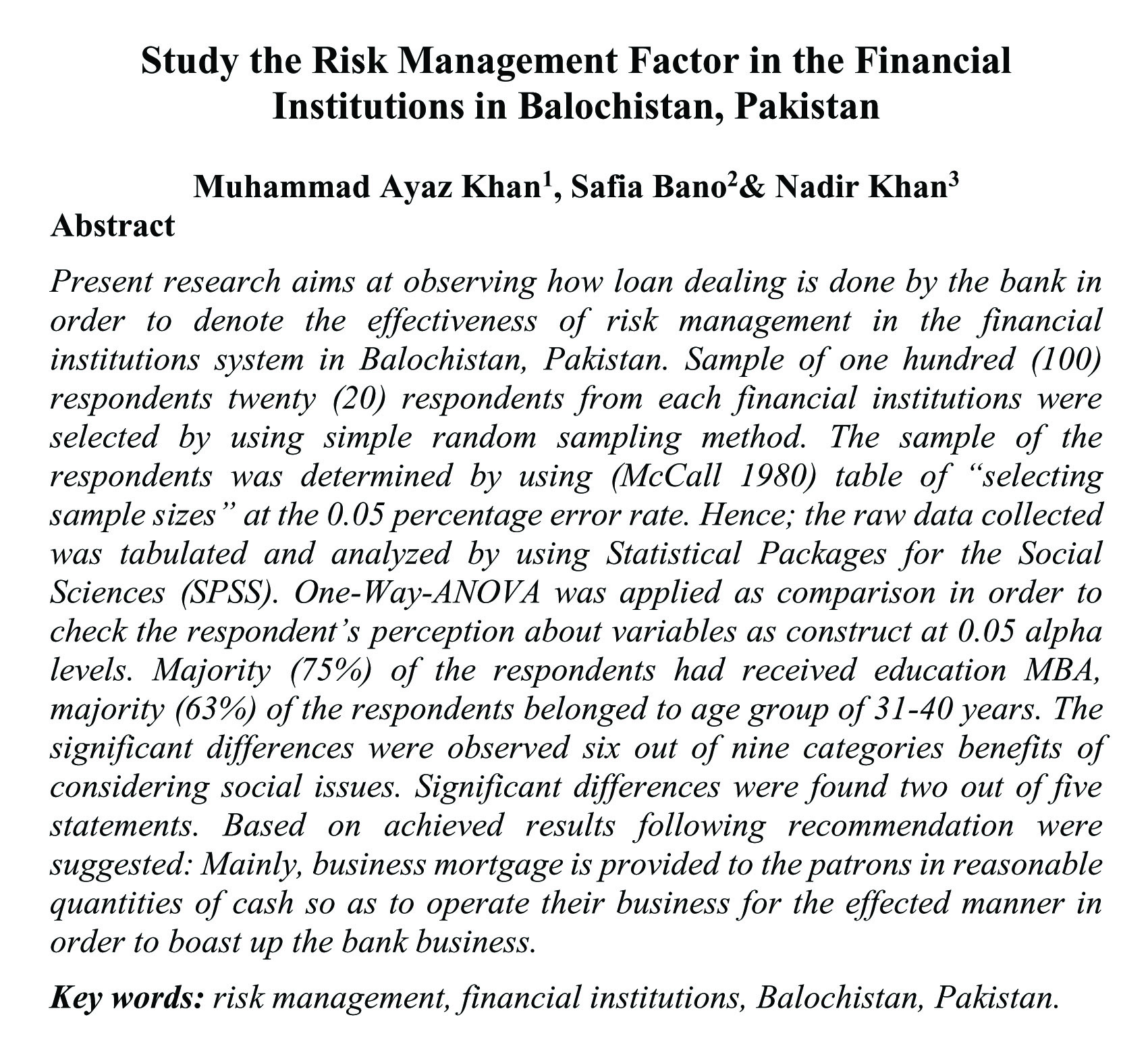 Study the Risk Management Factor in the Financial Institutions in Balochistan, Pakistan (abstract)