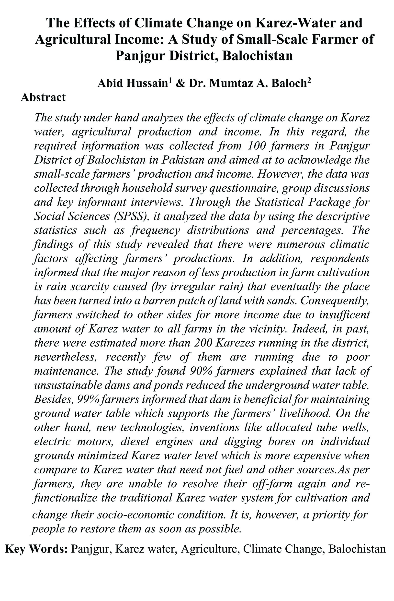 The Effects of Climate Change on Karez-Water and Agricultural Income: A Study of