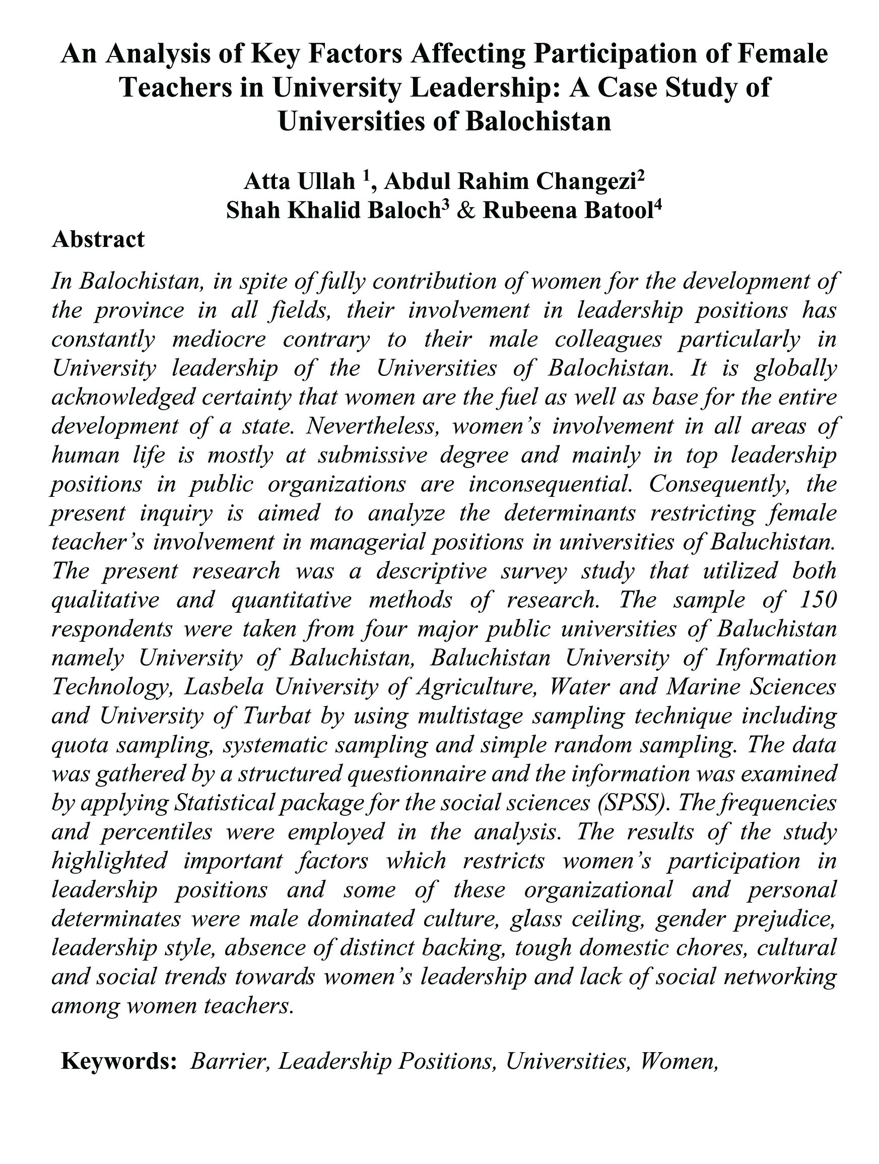 Abdul Qadir, Dr. Mirwais Kasi, Zahir Mengal, Ms. Hussan Ara Maggasi pp.257-264 |