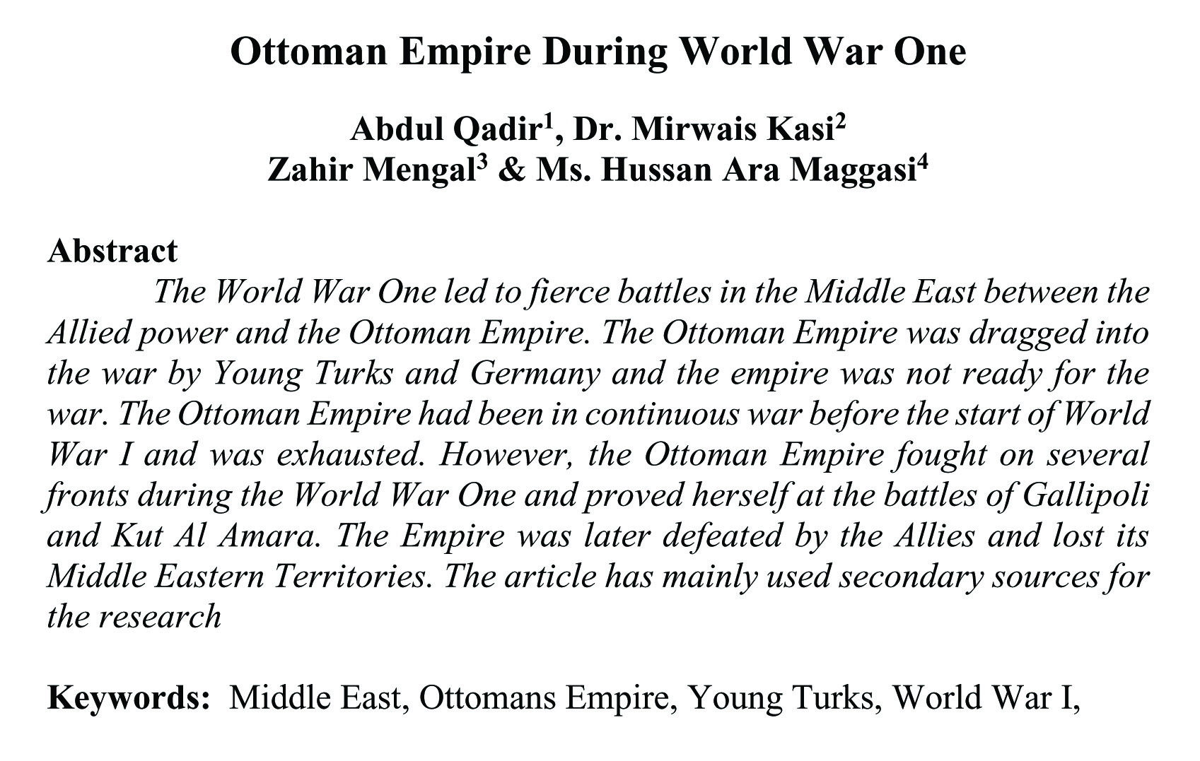Ottoman Empire During World War One (abstract)