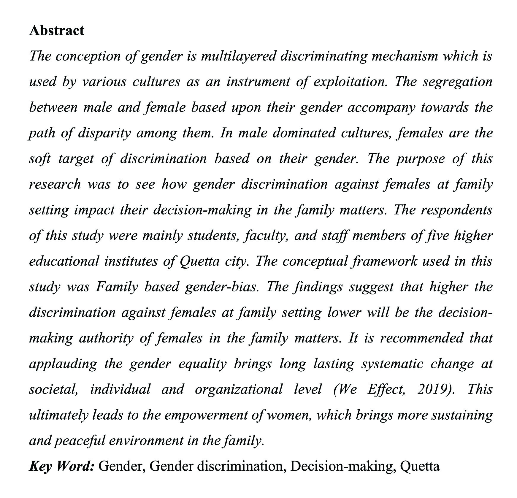 Gender Discrimination against Females at Family Setting and its Impact on their Decision- Making: A Sociological Assessment Study of Quetta City (abstract)
