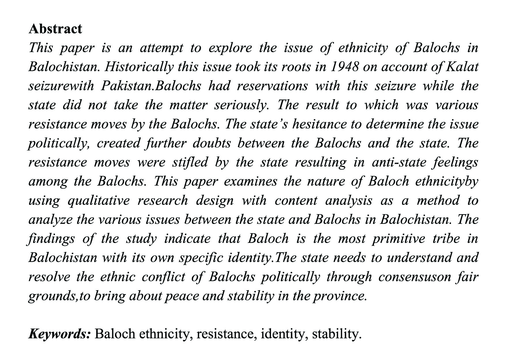 The Problems of Baloch Ethnicity in Balochistan: Paving Way Towards Betterment Through Political Consensus (abstract)