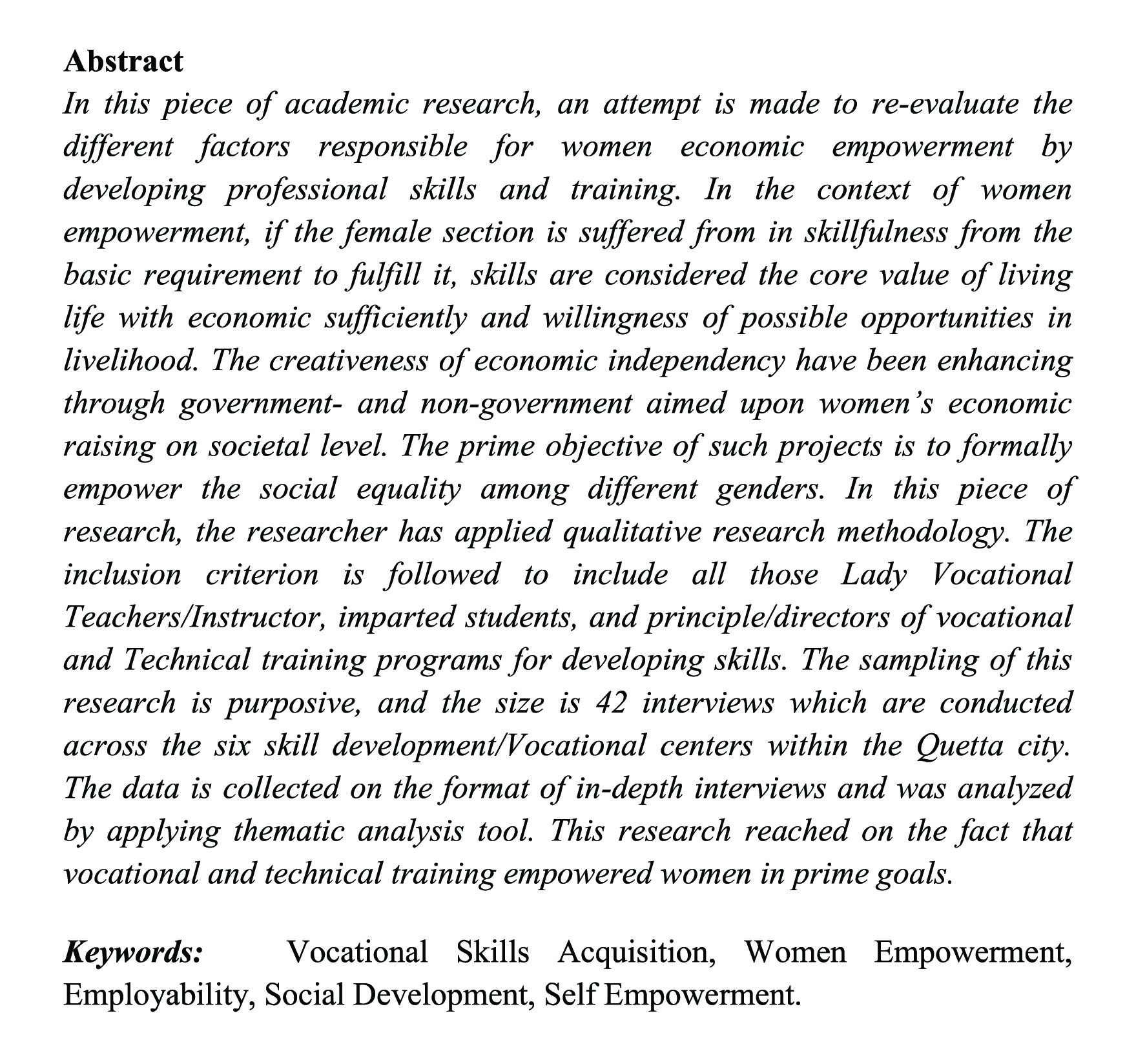 Effectiveness of Vocational Skills Acquisition Programmes on Women Empowerment in Quetta. (abstract)