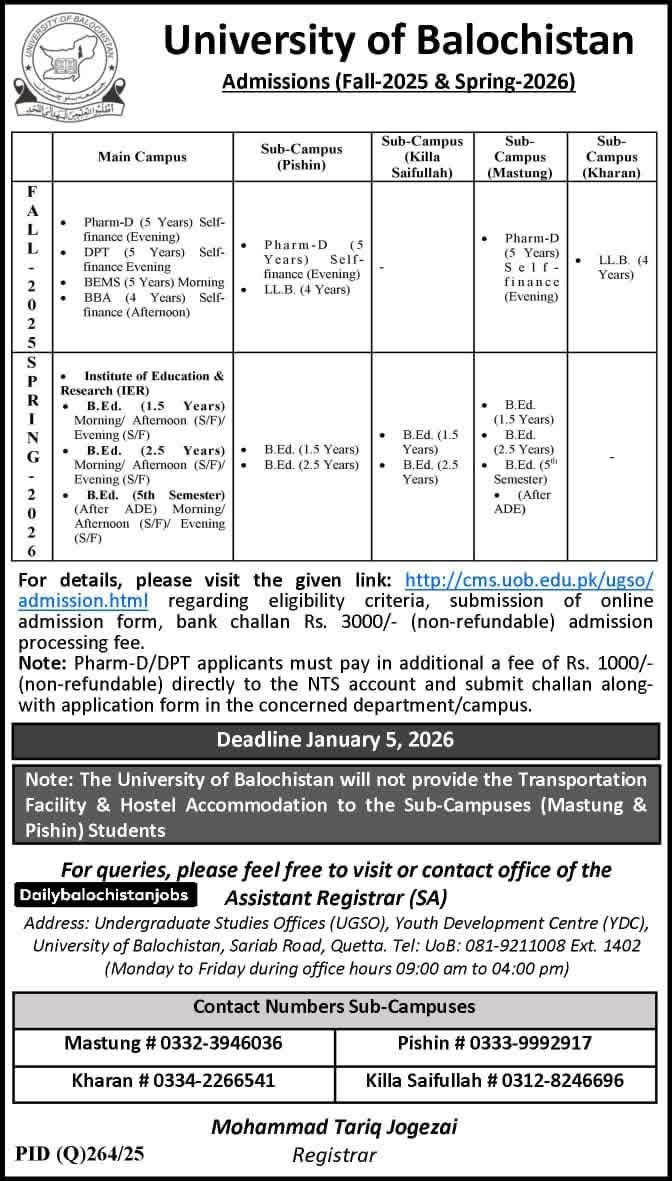 of Pharmacy (Main campus), Mastung Campus, Pishin Campus and Doctor of Physical