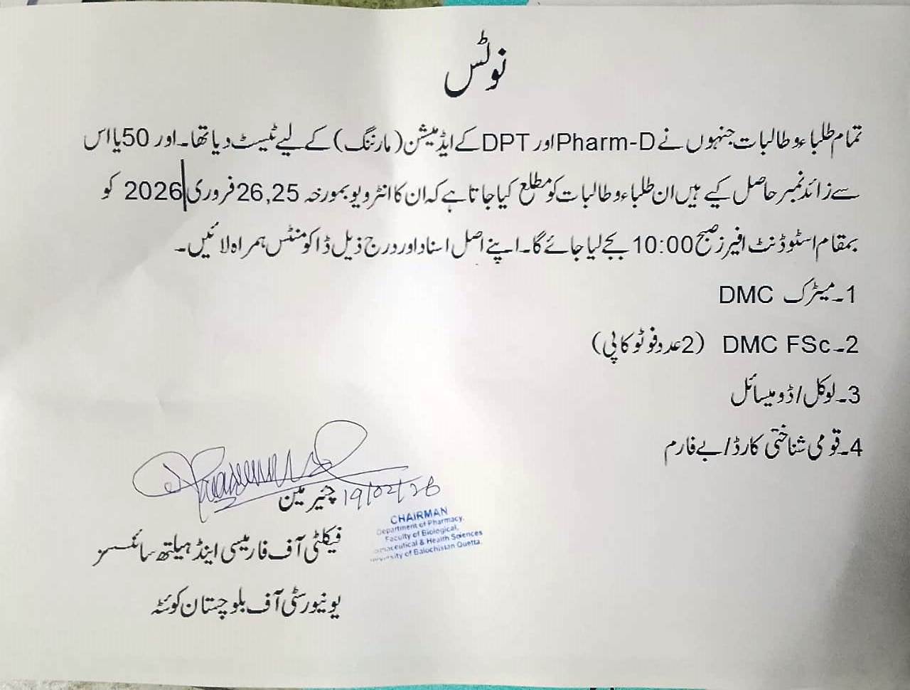 The students applying for admission in Sub Campus Mastung and Pishin are