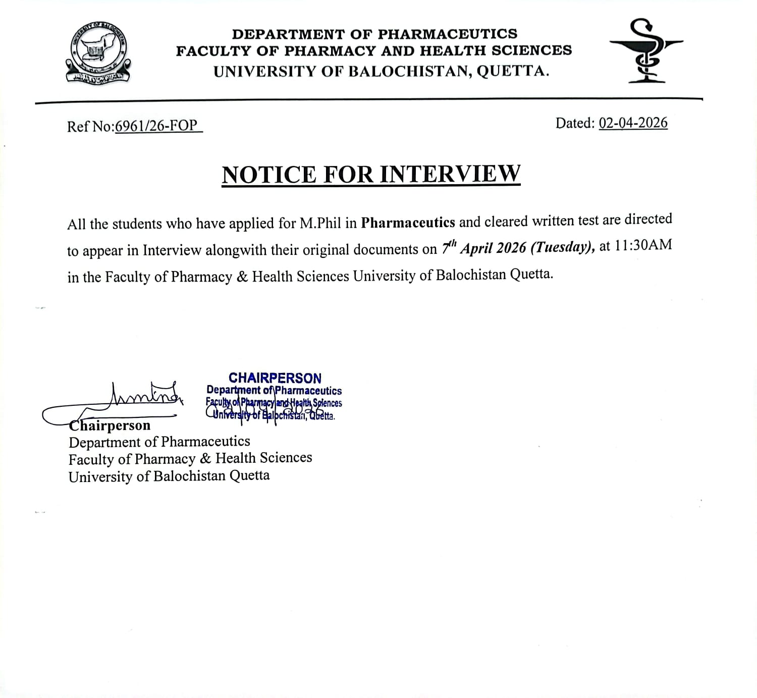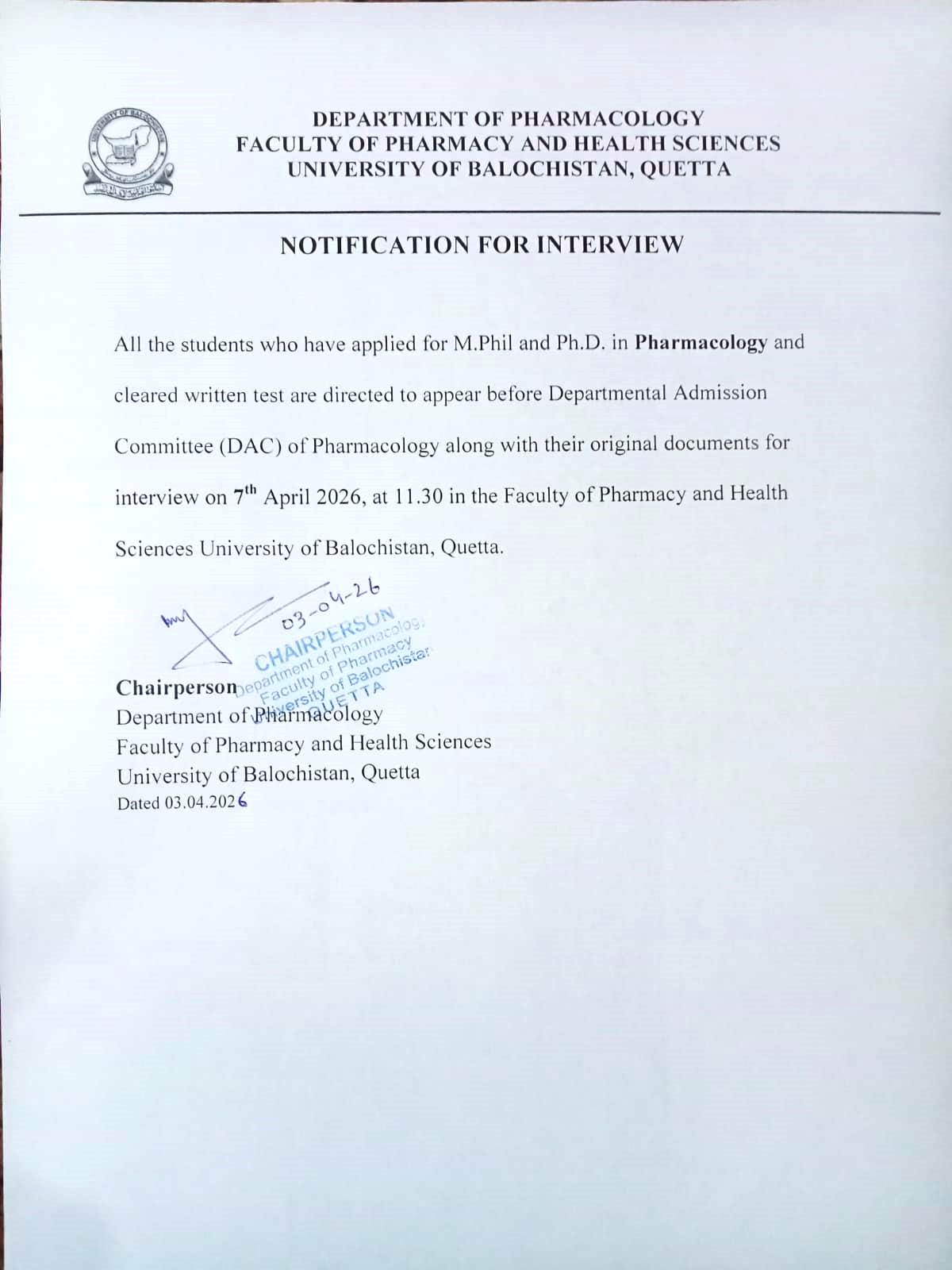 Interview Notice for PhD Pharmacology