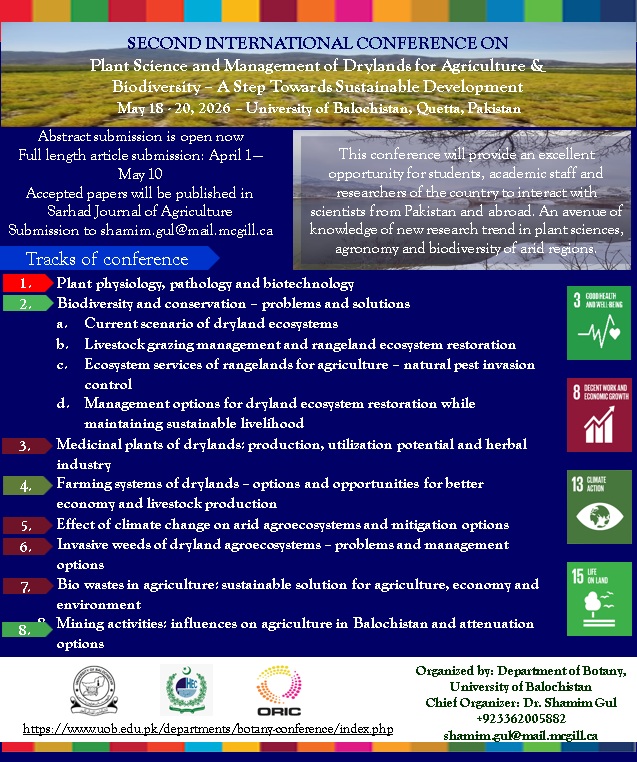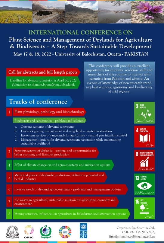 | INTERNATIONAL CONFERENCE ON Plant Science and Management of Drylands for Agriculture & Biodiversity - A Step Towards Sustainable Development May 17 & 18, 2022 - University of Balochistan, Quetta, Pakistan |