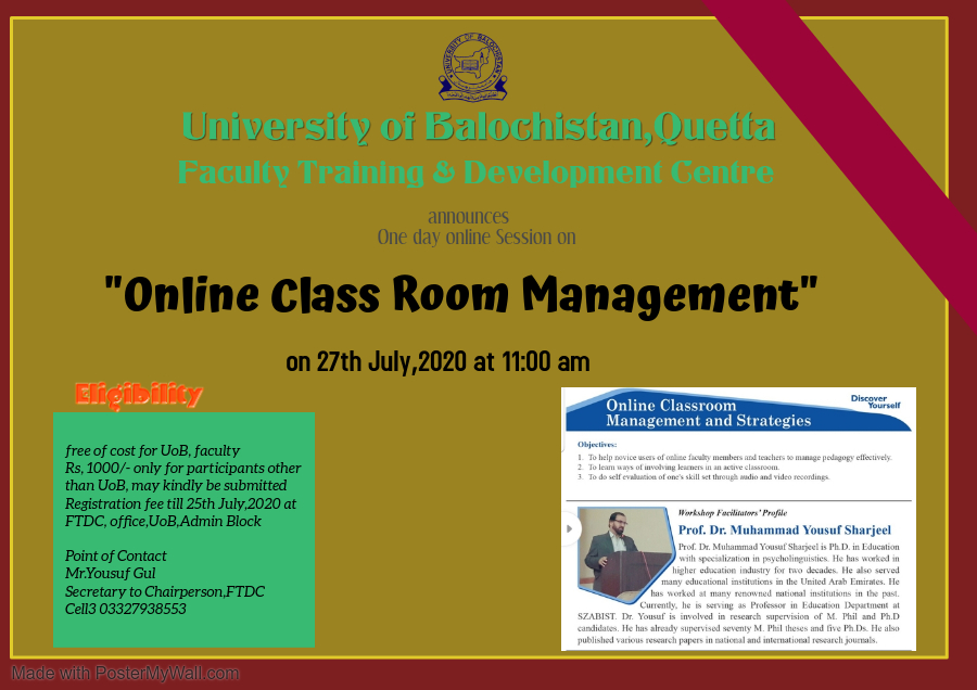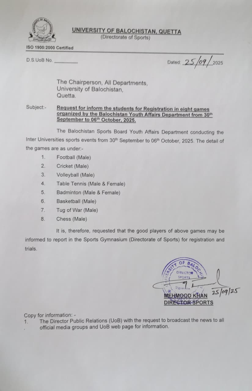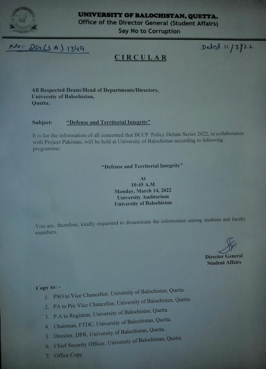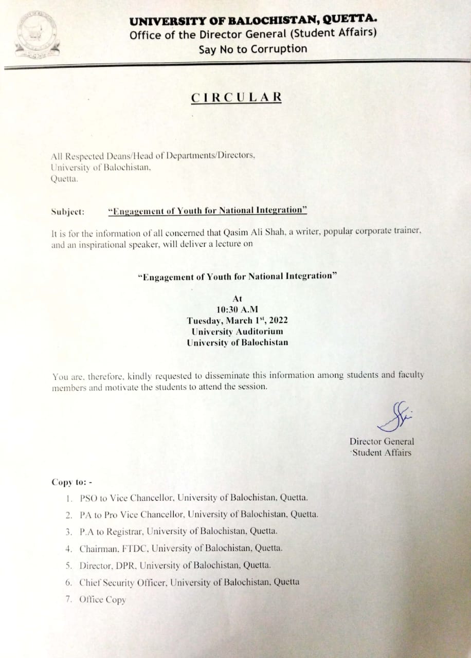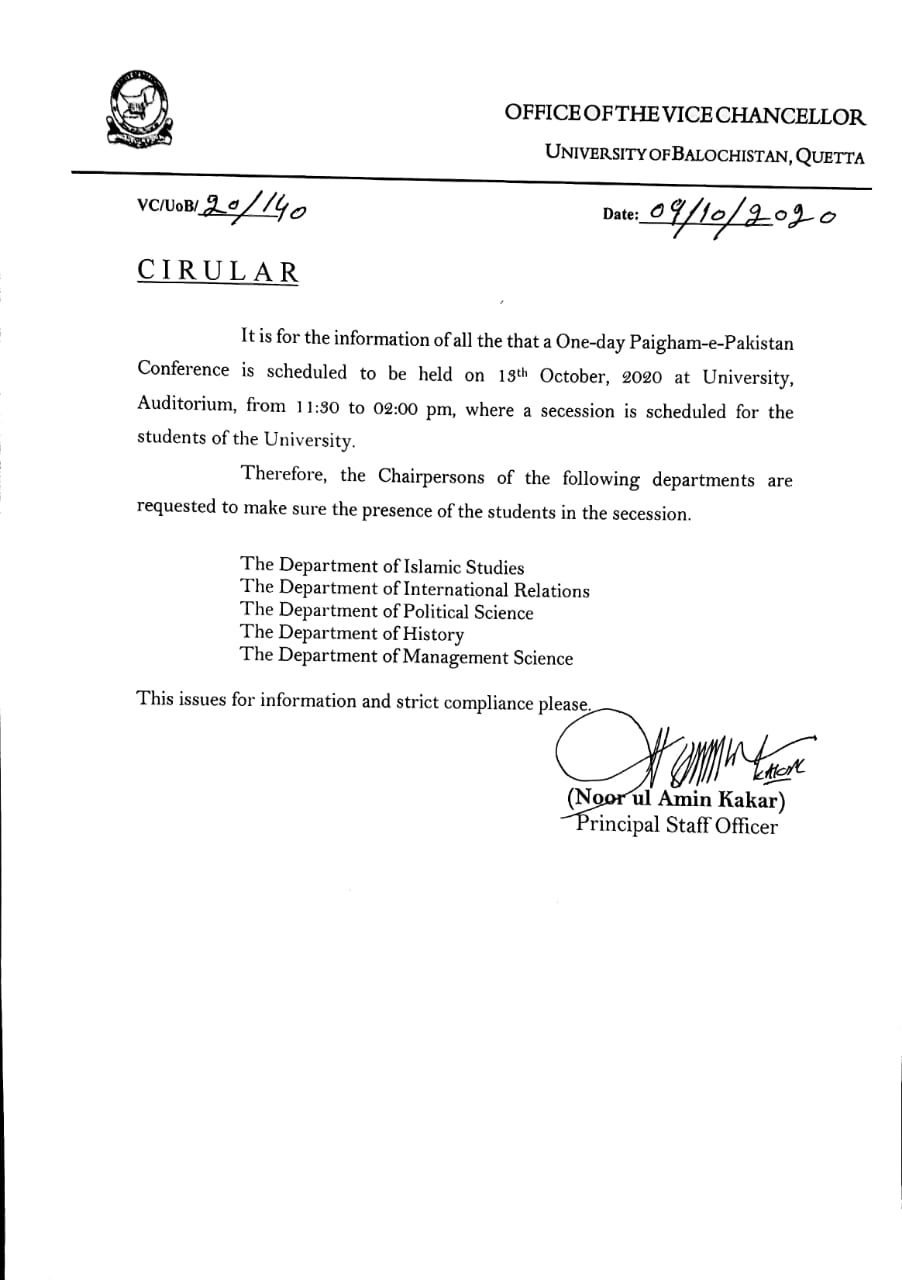 One hour Seminar on "Wafafaqi Mohtasib Office" will be held on 03-12-19 at 10:00 AM Till 11:00 AM in the Auditorium of UoB. |