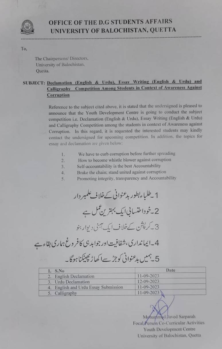 | Declamation (English & Urdu), Essay writing (English & Urdu) and Calligraphy competition among students in context of awareness against Corruption |