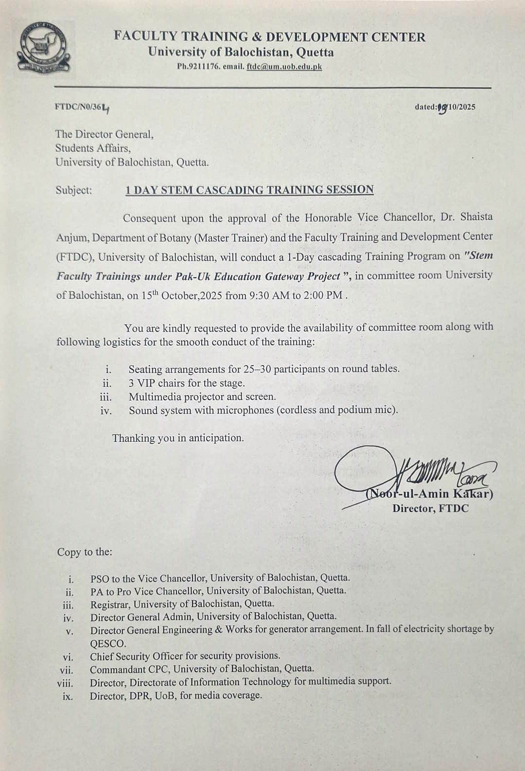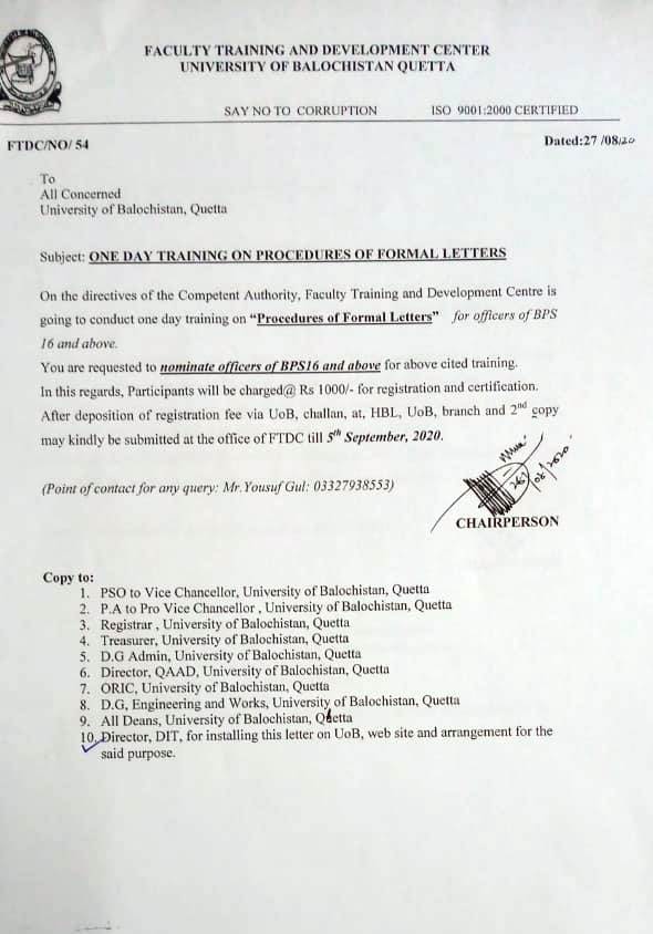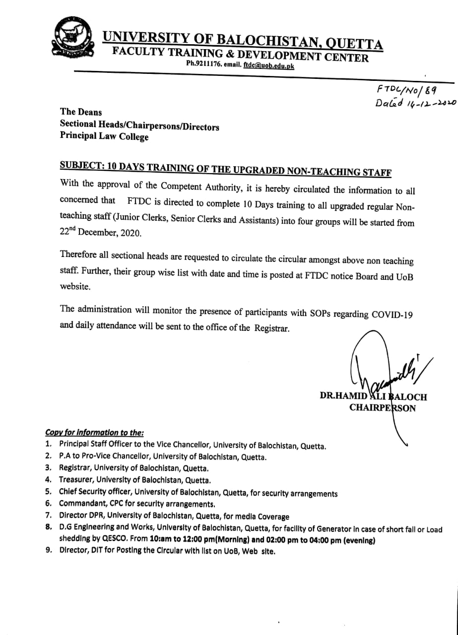 | 10 Days Professional Development Training for Upgraded Administrative staff University of Balochistan |