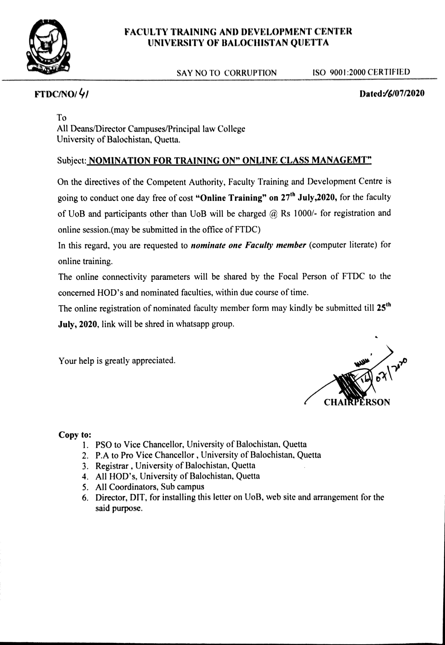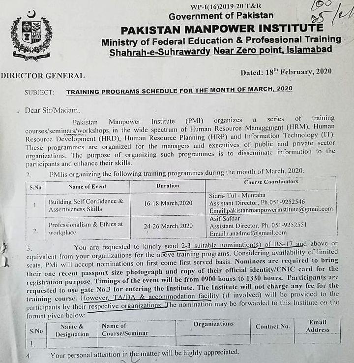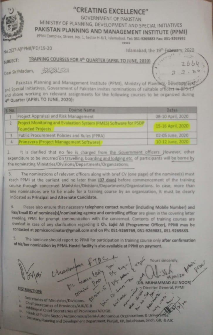 Training Courses for 4th Quarter (April to June 2020) Nominations Required for training of BPS-17 and above (FTDC) |