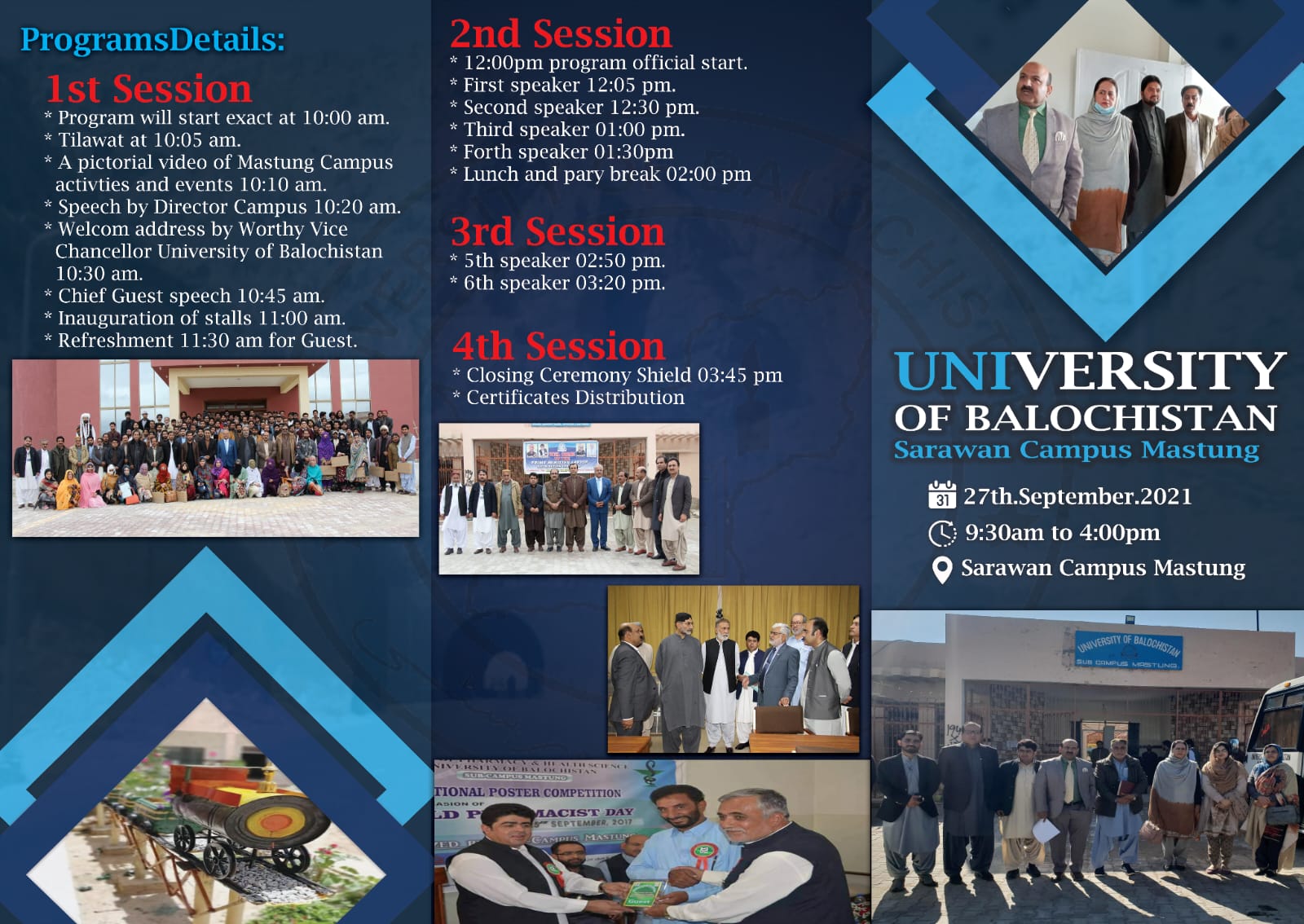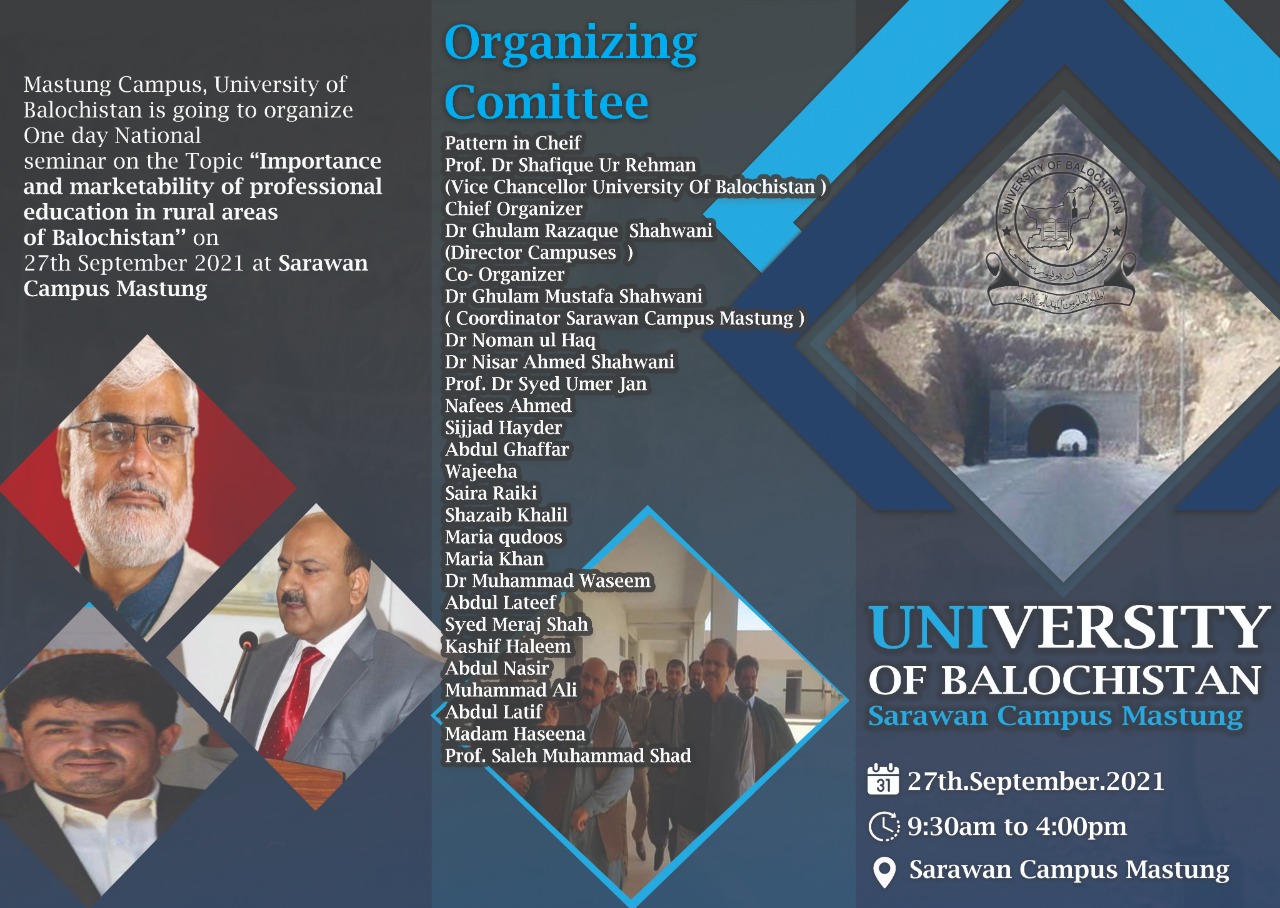 | One day National Seminar on the topic "Importance and marketability of professional education in rural areas of Balochistan" on 27 Sep 2021 at Sarawan Campus Mastung. |