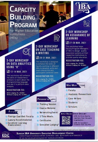 3 days Workshop on Data Analytics using "R" (March 12-14, 2021) 02 days Workshop on Case Teaching and Writing (March 20-21, 2021) 02 days Workshop on Assurance of Learning (March 27-28, 2021)