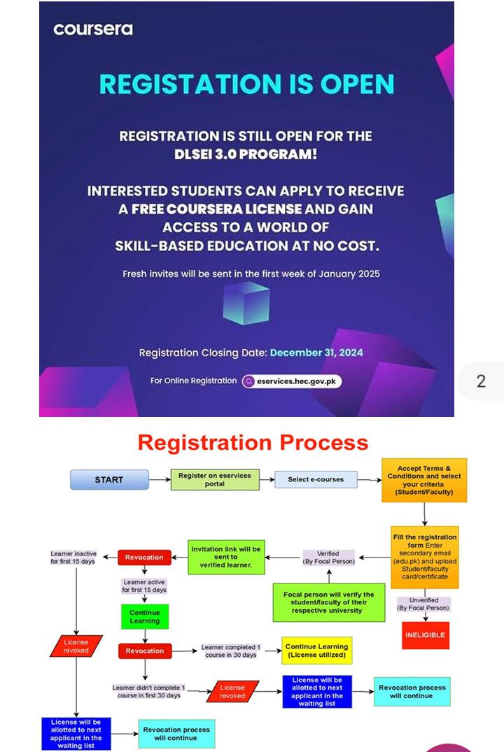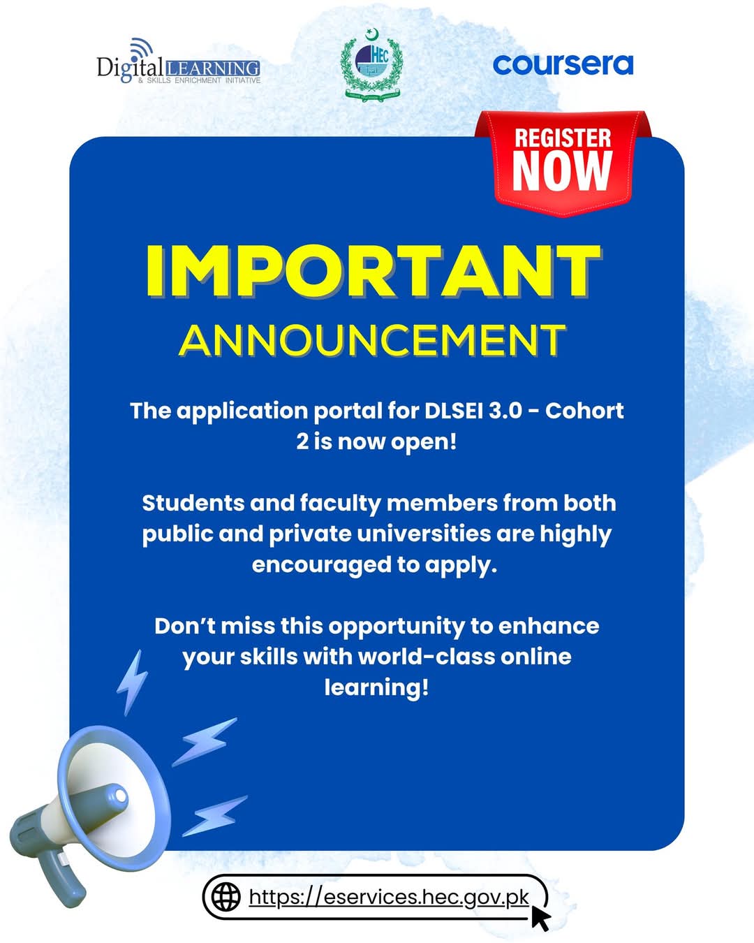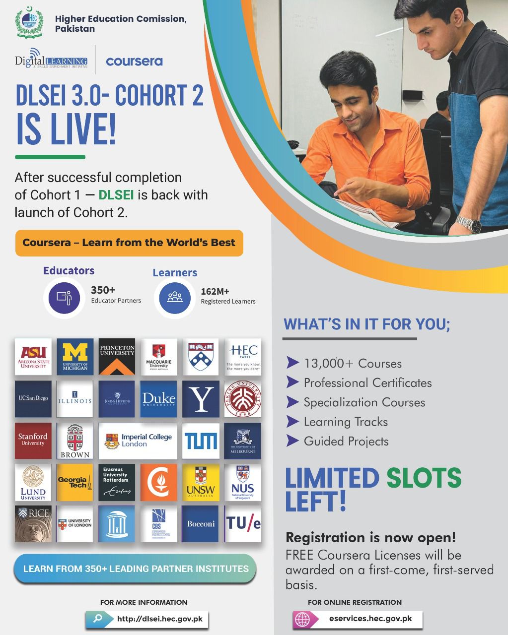 | DLESI 3.0 program registrations are open. Interested students and faculty members can directly apply on http://eservices.hec.gov.pk to receive a free Coursera License to gain access to a world of skillbased education at no cost |
