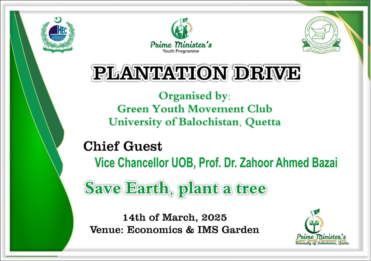 | "PLANTATION DRIVE" Organized by Green Youth Movement Club UoB (Venue: Economics & IMS Garden on 14th March 2025) |