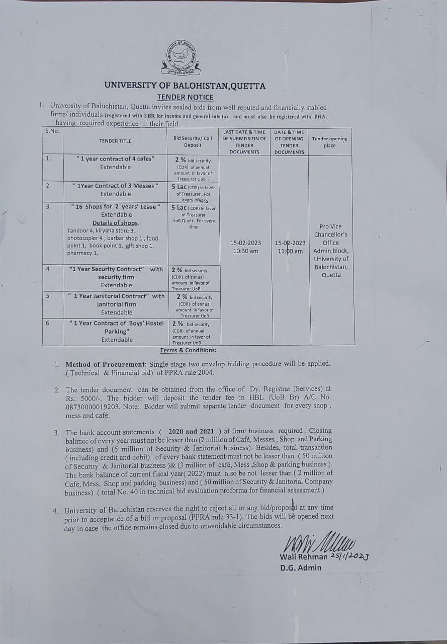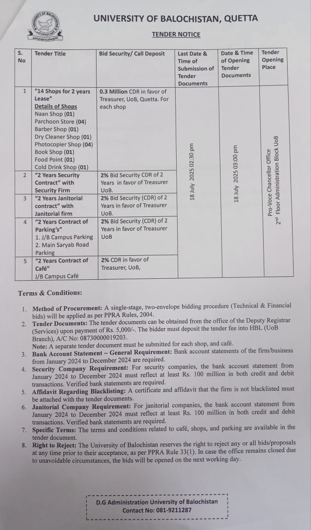 Tender Notice: 14 shops for 2 years lease , 2 years Security contract with security firm, 2 years Janitorial contract with Janitorial firm, 2 years contract of Parking, 2 year contract of Cafe.