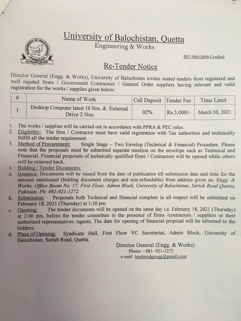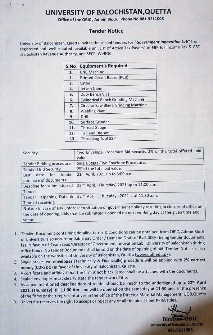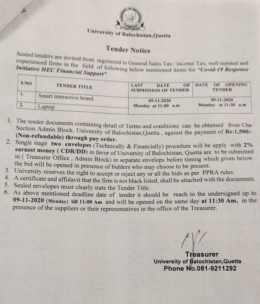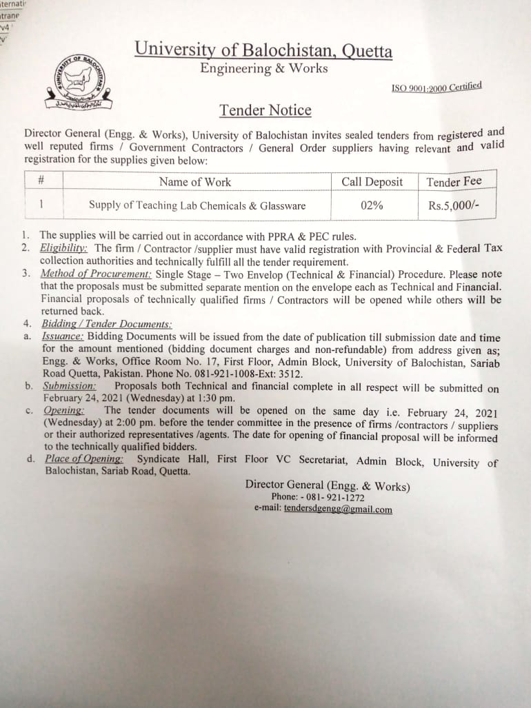 Tender Notice Supply of Teaching aid Equipments (for sub campuses Kharan & Mastung) , Hybrid PABX Exchange & ICT equipments (for JB Campus) University of Balochistan