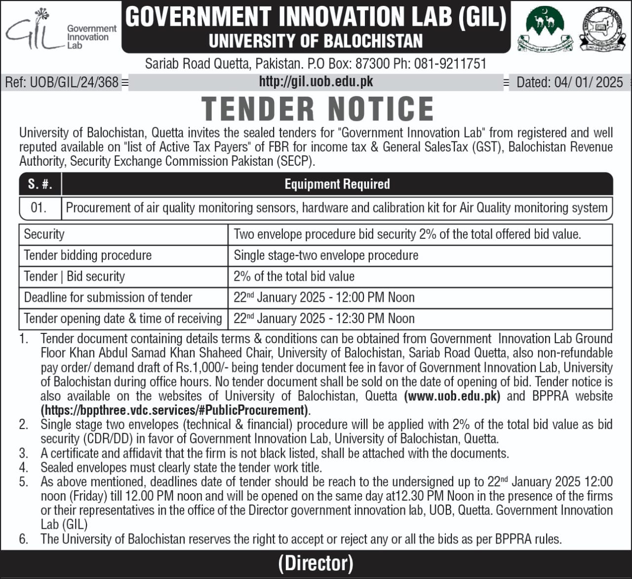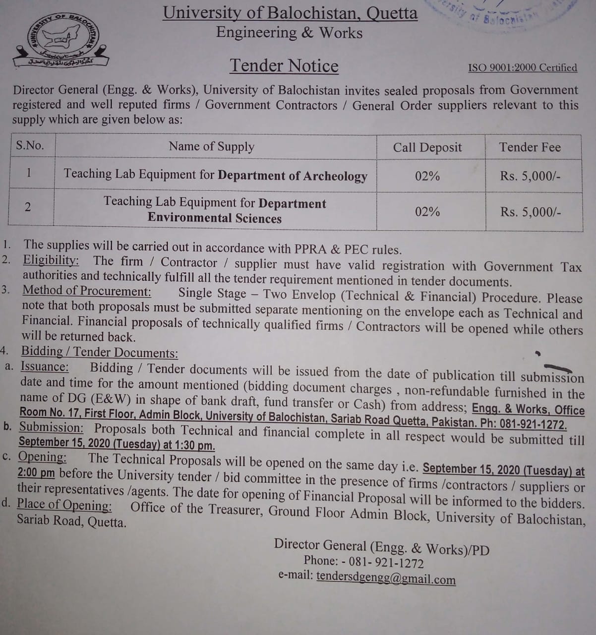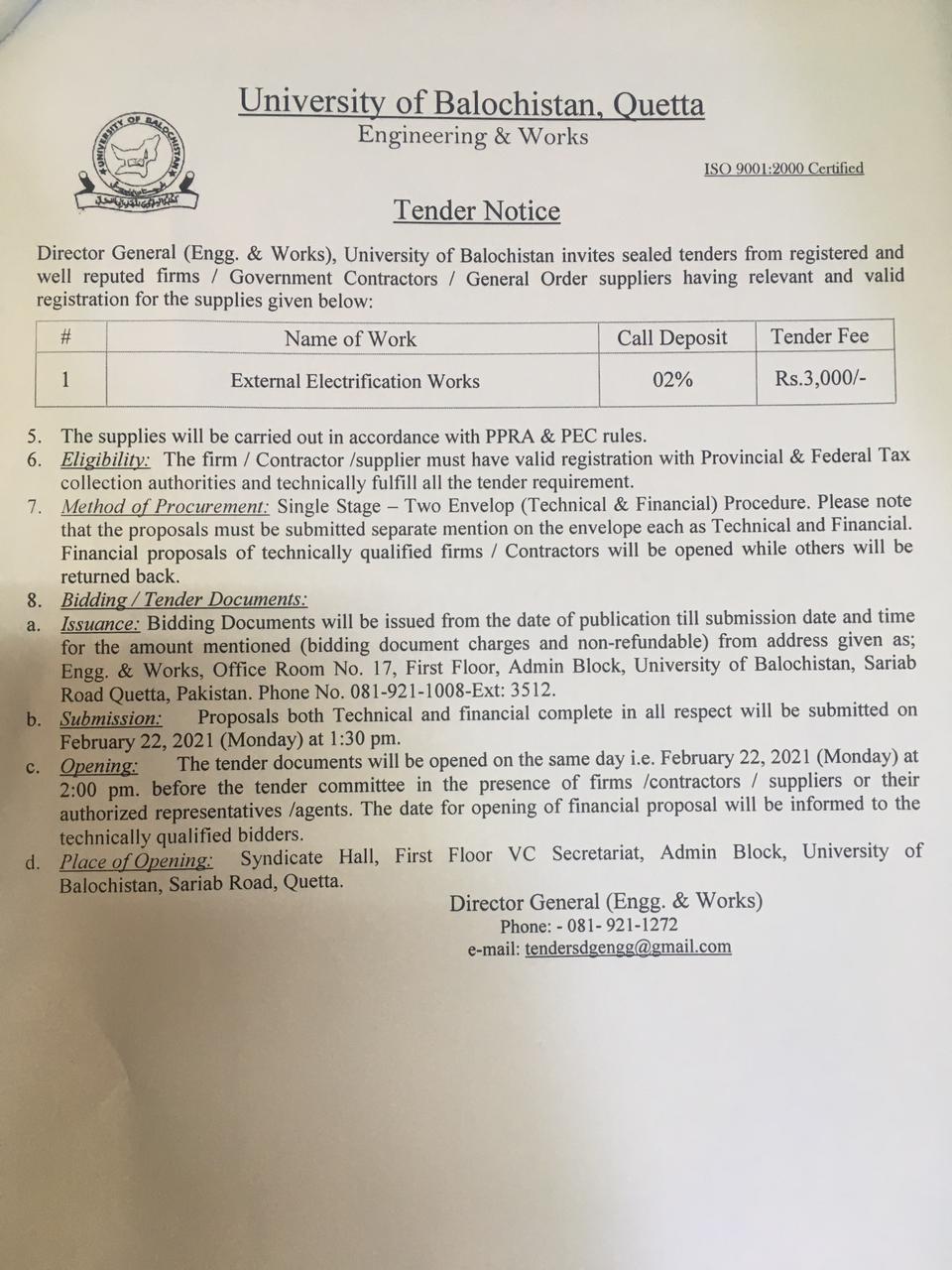 Tender Notice Supply of Teaching aid Equipments (for sub campuses Kharan & Mastung) , Hybrid PABX Exchange & ICT equipments (for JB Campus) University of Balochistan