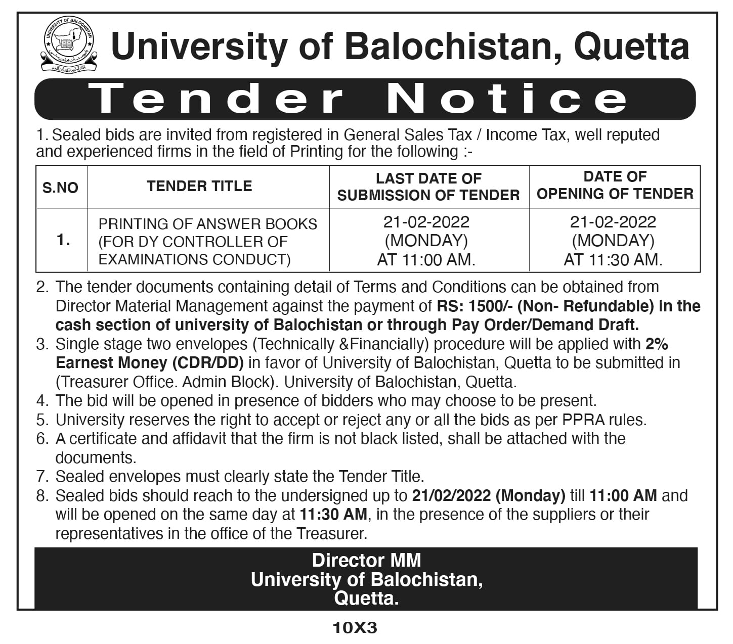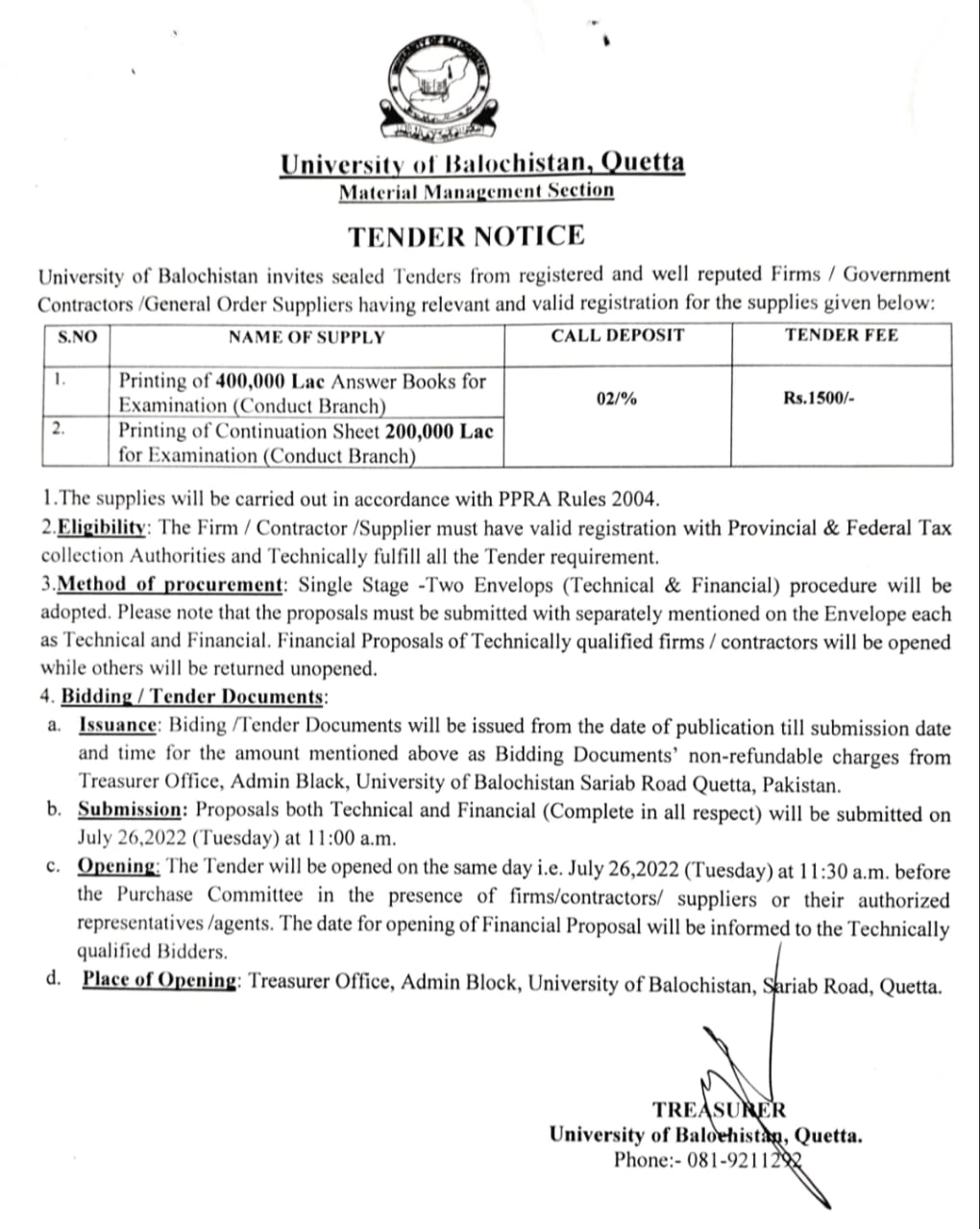 Tender Notice: Printing of Answer Books