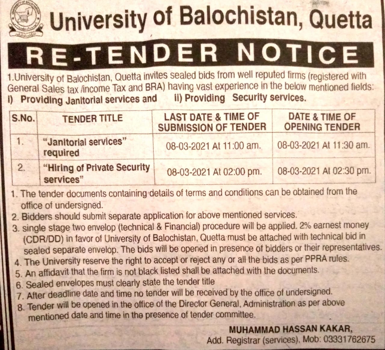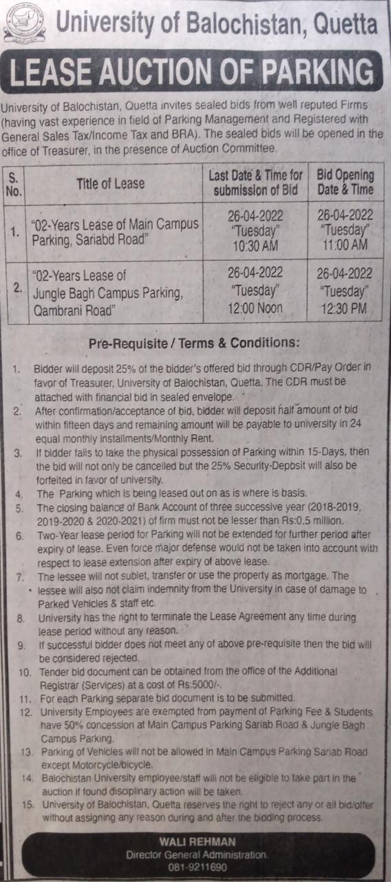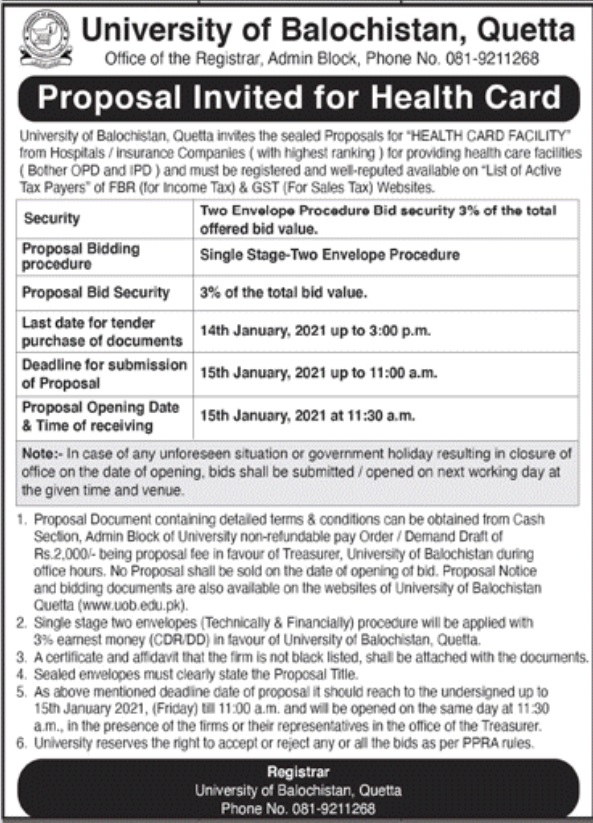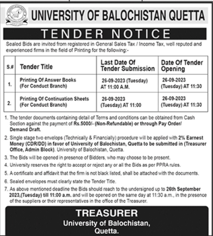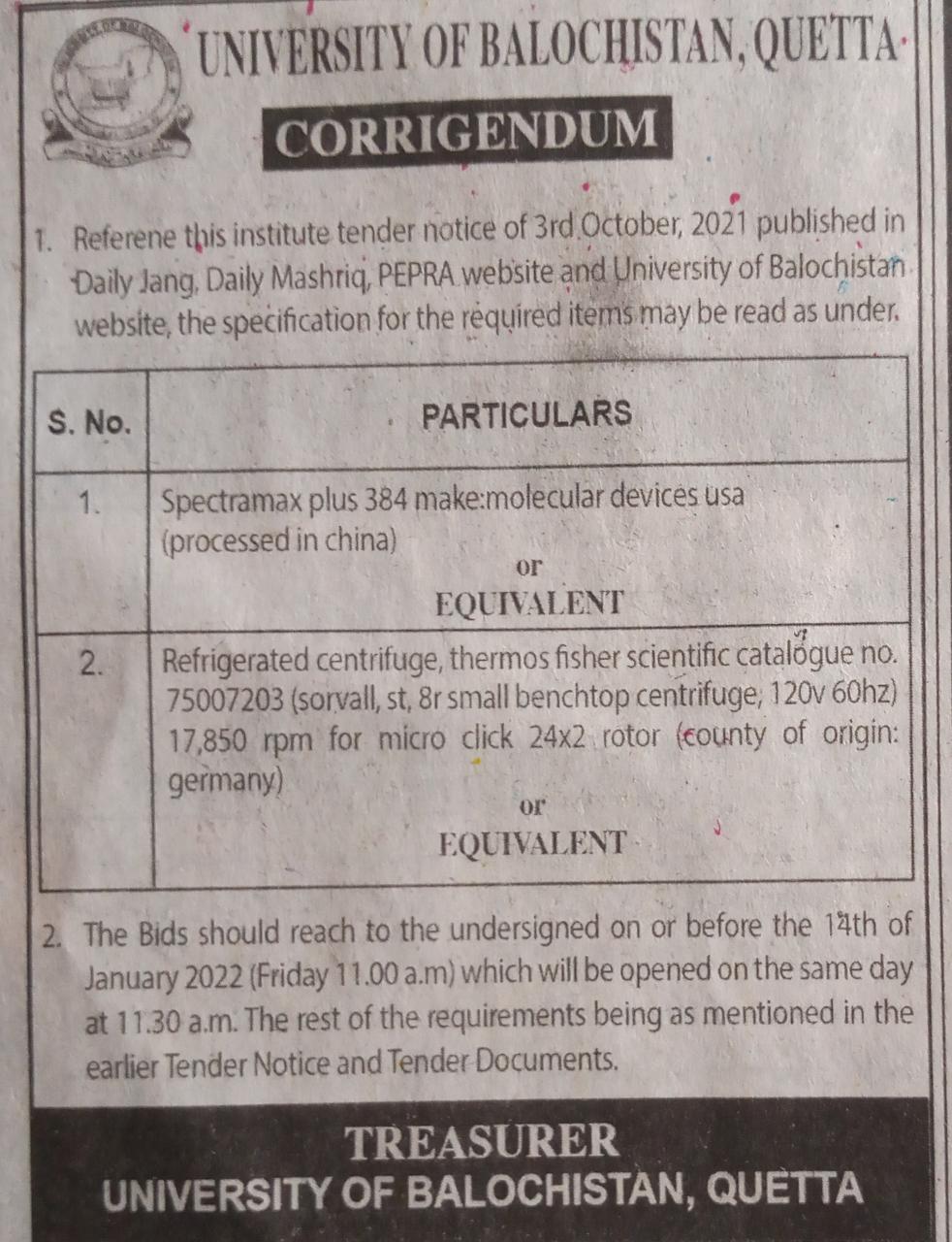 Corrigendum (Tender Notice): University of Balochistan, Quetta invite sealed bids from reputable chartered Accountant firm to hire against the following services