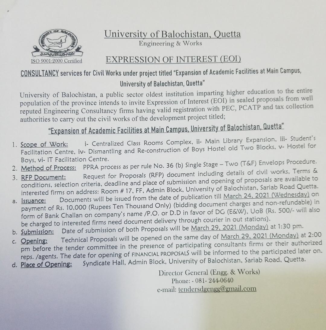 Expression of Interest (EOI) Consultancy services for civil works project titled "Expansion of Academia facilities at main campus, University of Balochista, Quetta"