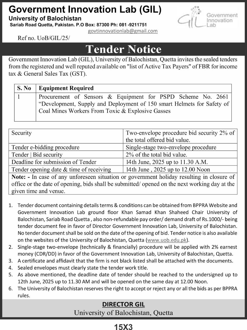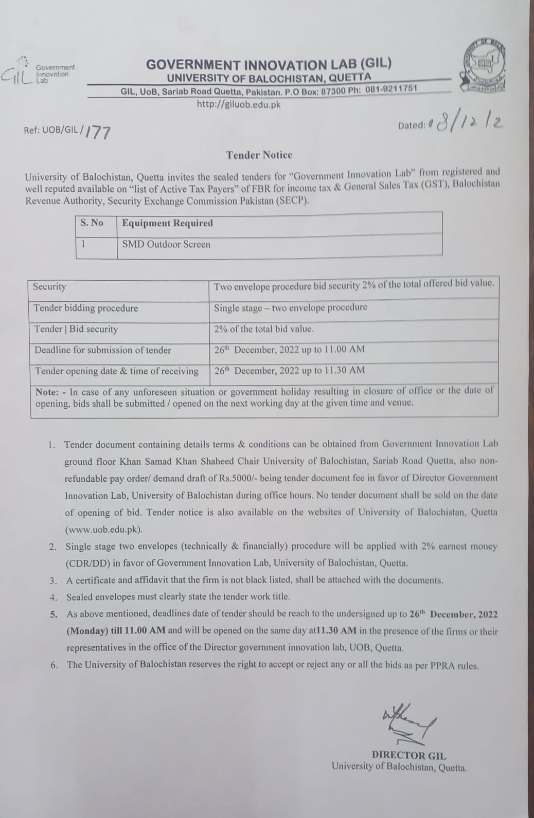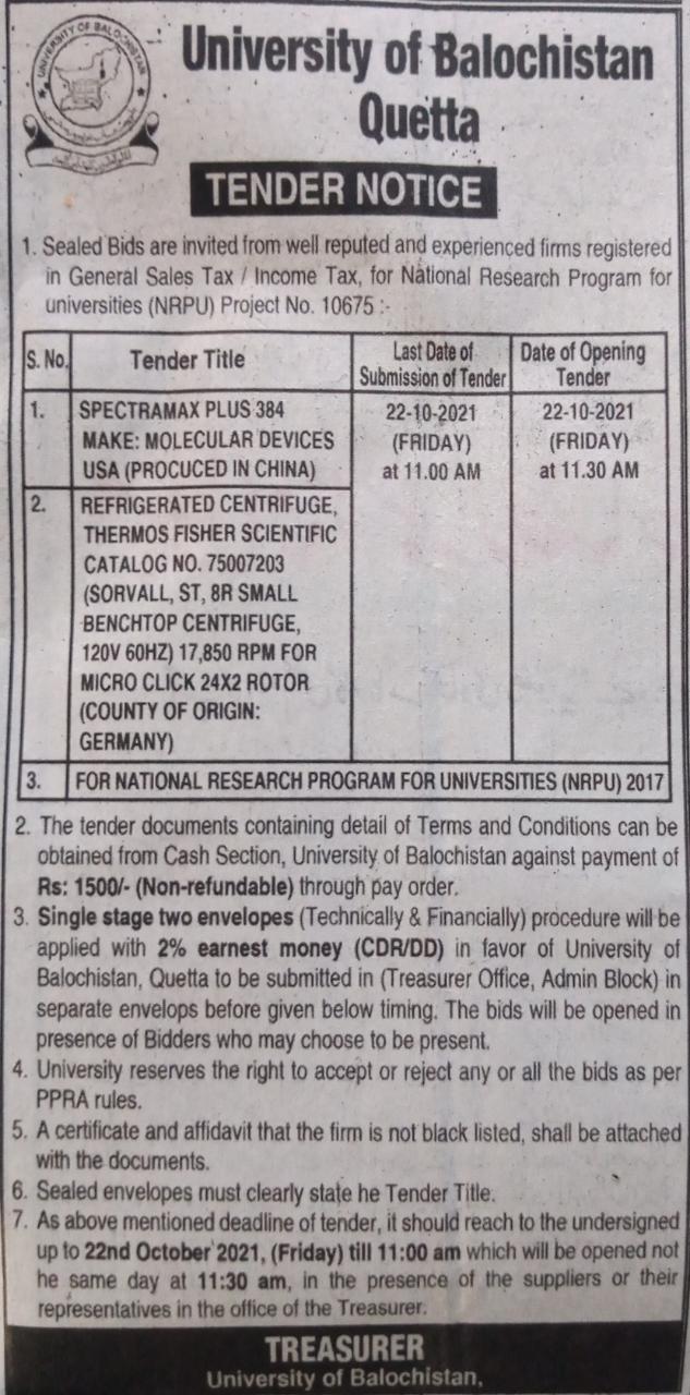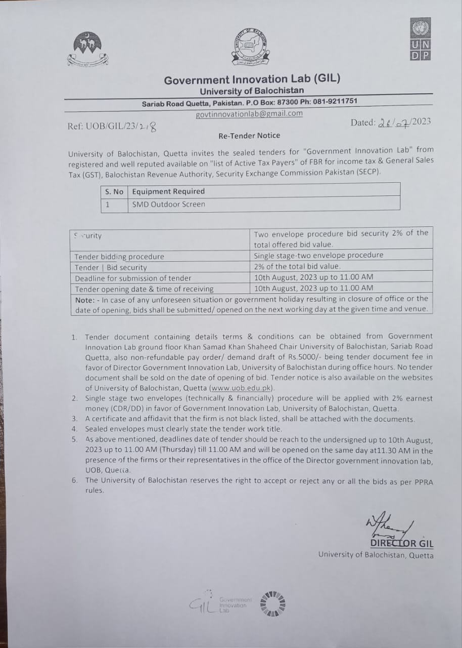 Tender Notice: Supply of Technical Aid Equipment of the project "Strengthening of the University of Balochistan, Quetta & its Campuses"