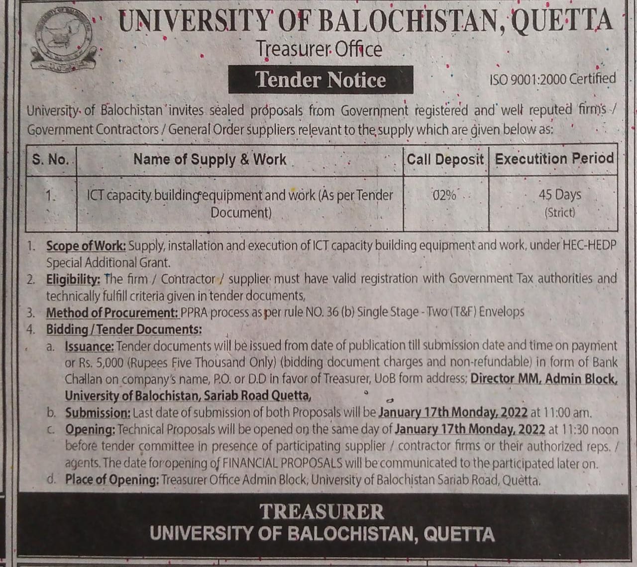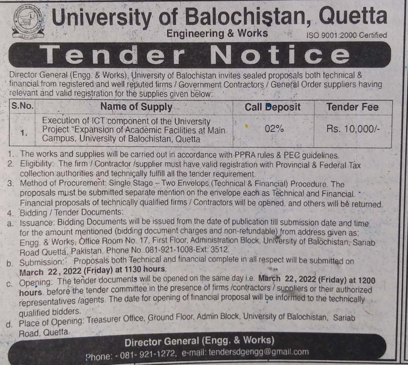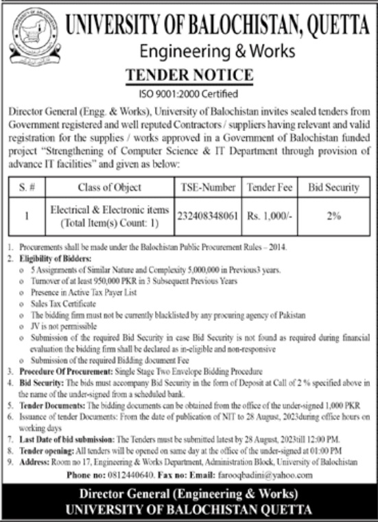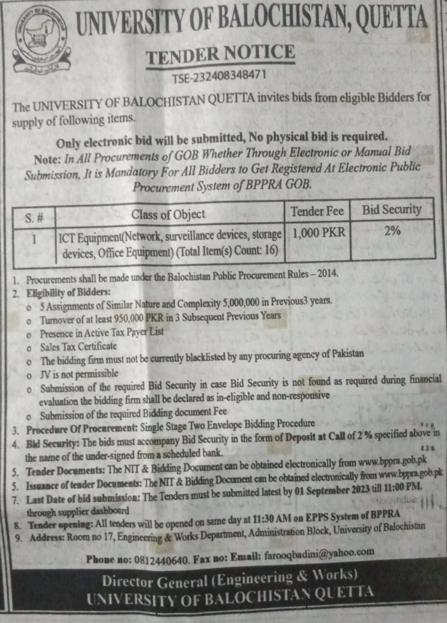 Tender Notice: "ICT Infrastructure",  "Furniture & Fixtures" for the University Project "Expansion of Academic Facilities at Main Campus, University of Balochistan, Quetta.