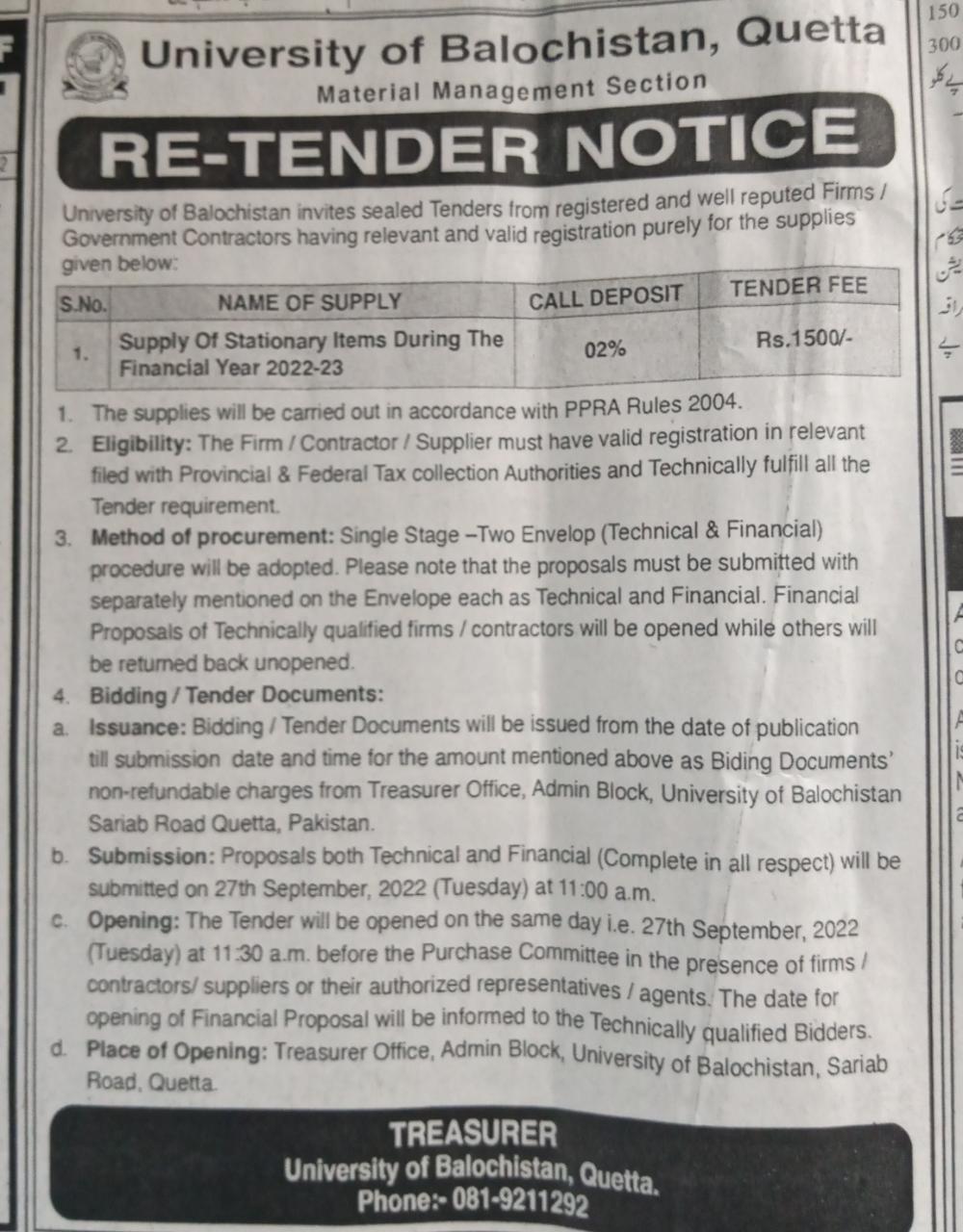 Re-Tender Notice: "Supply of Stationery Items for the financial 2022-23"