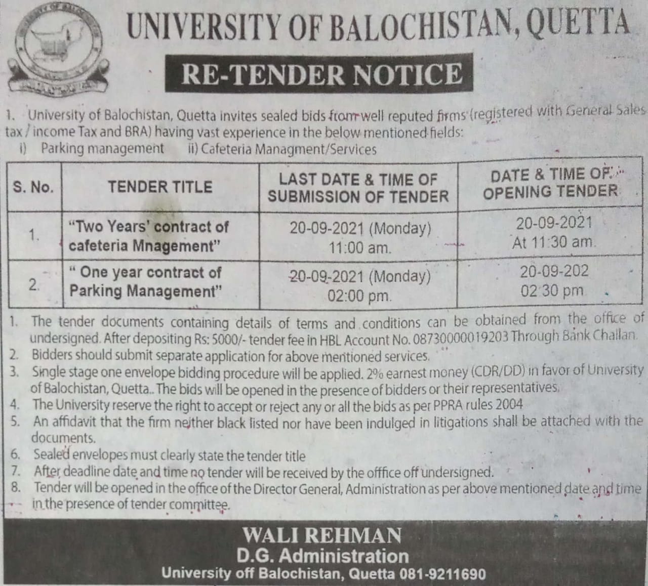 Re-Tender Notice of "Two years contract of cafeteria Management" & "One year contract of parking Management"
