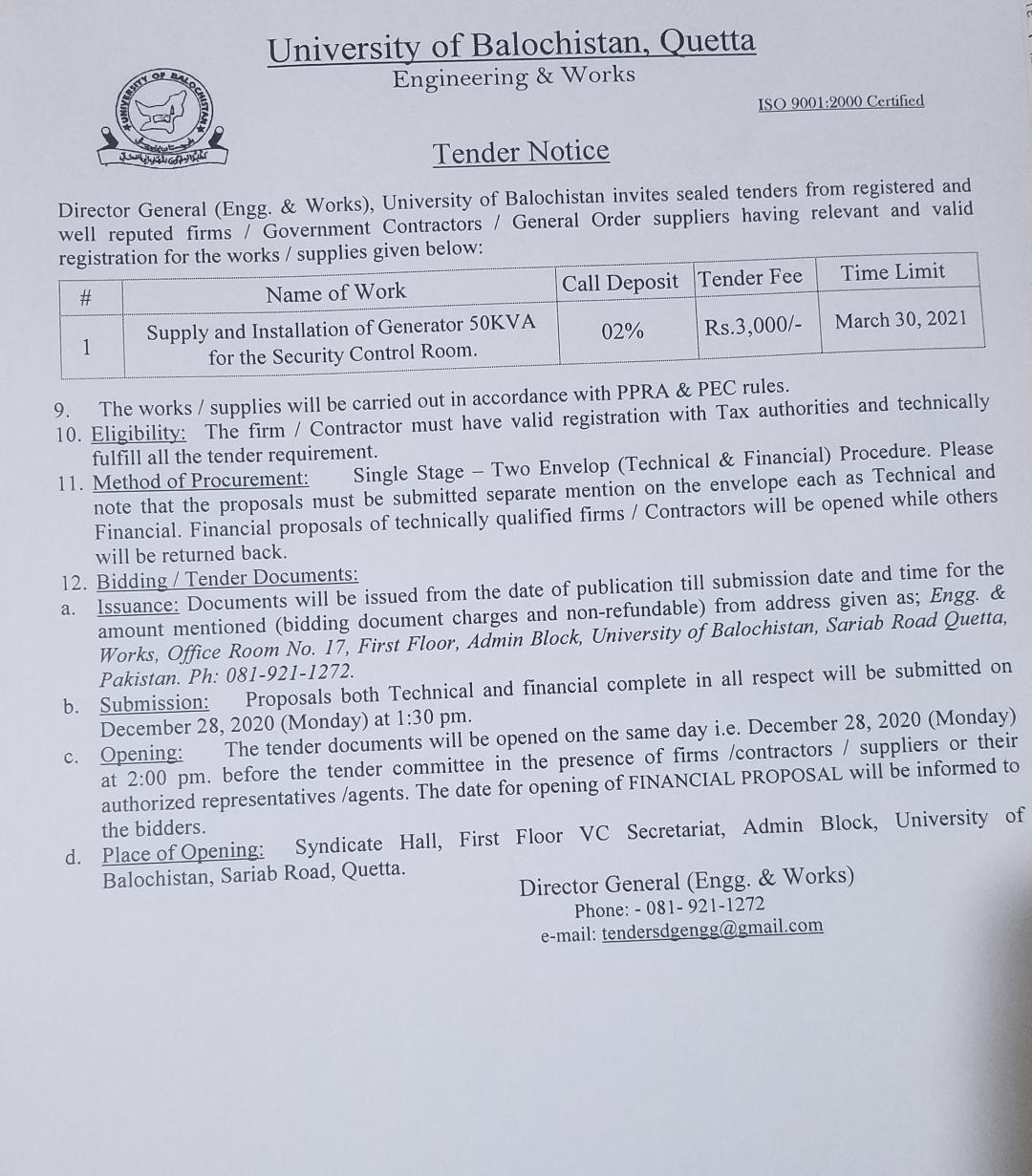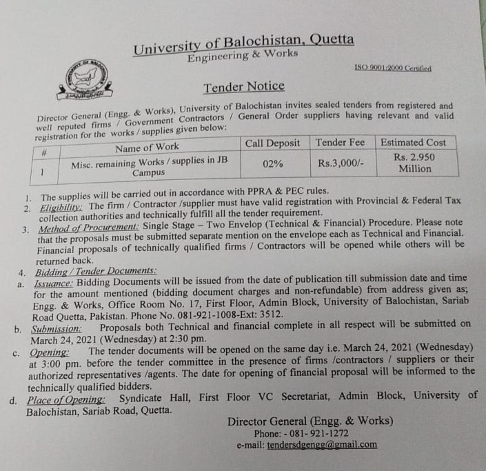 Tender Notice: Miscellaneous Repairs, Renovations & Maintenance Works in the Campus, University of Balochistan.