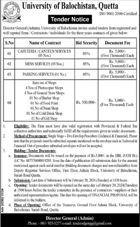 Tender Notice: Tender Notice of "One years contract of cafes, Messes, Security Contract, Janitorial Contract, Parking"