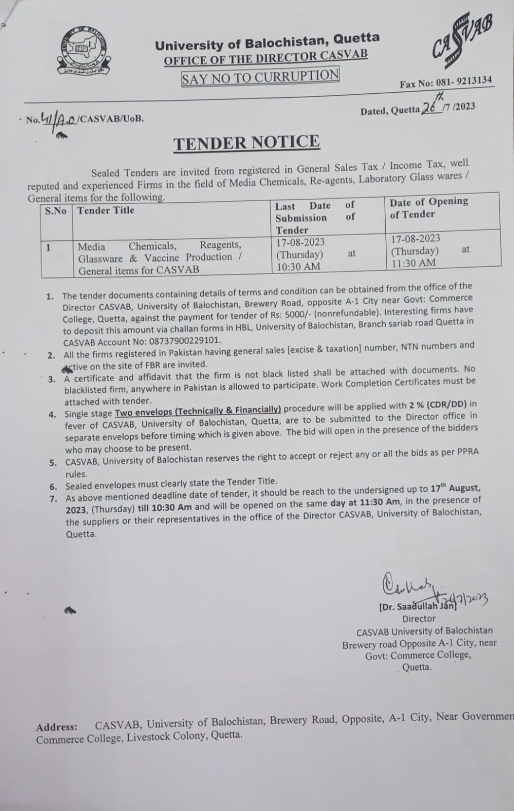 Tender Notice: Supply of LAB CHEMICALS for the Pharmacy Departments at Sub Campuses Pishin & Mastung