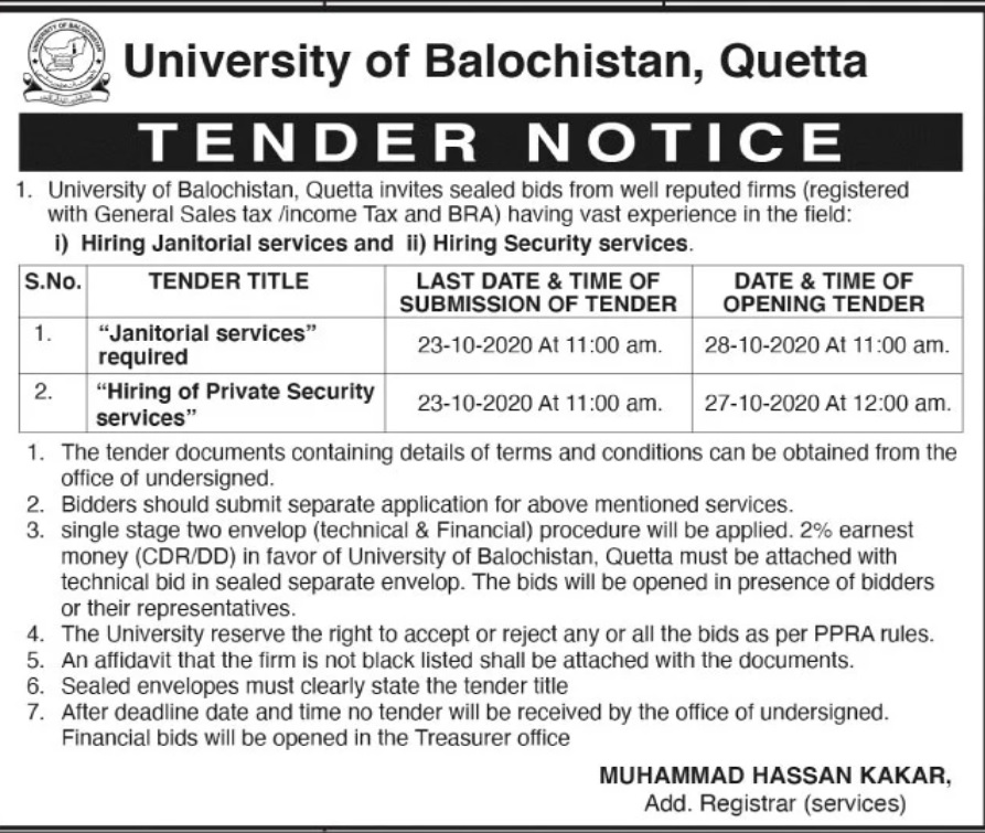 Tender Notice: University of Balochistan, Quetta invite sealed bids from reputable chartered Accountant firm to hire against the following services,