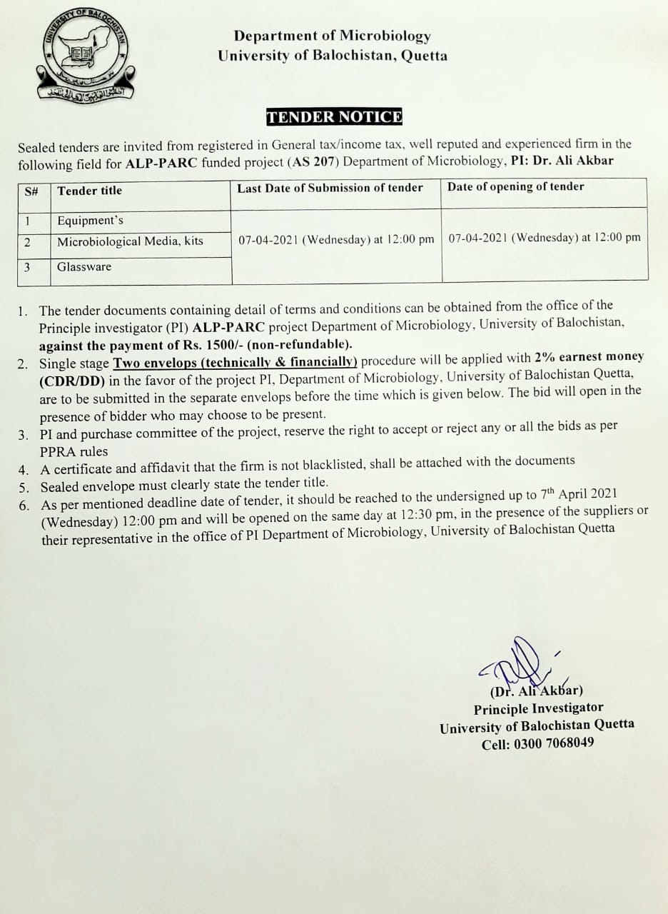 Tender Notice: Purchasing of Glassware / Chemicals (Department of Microbiology under NRPU-HEC project)