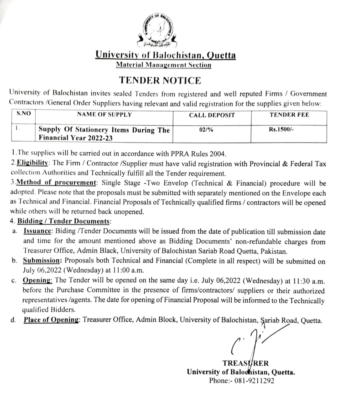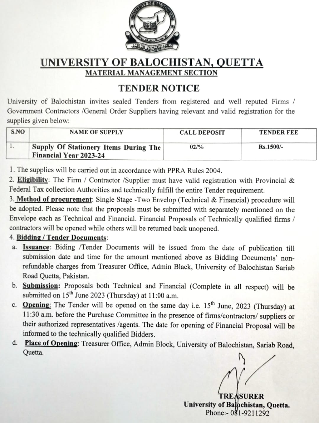 Tender Notice: Supply of Stationary Items