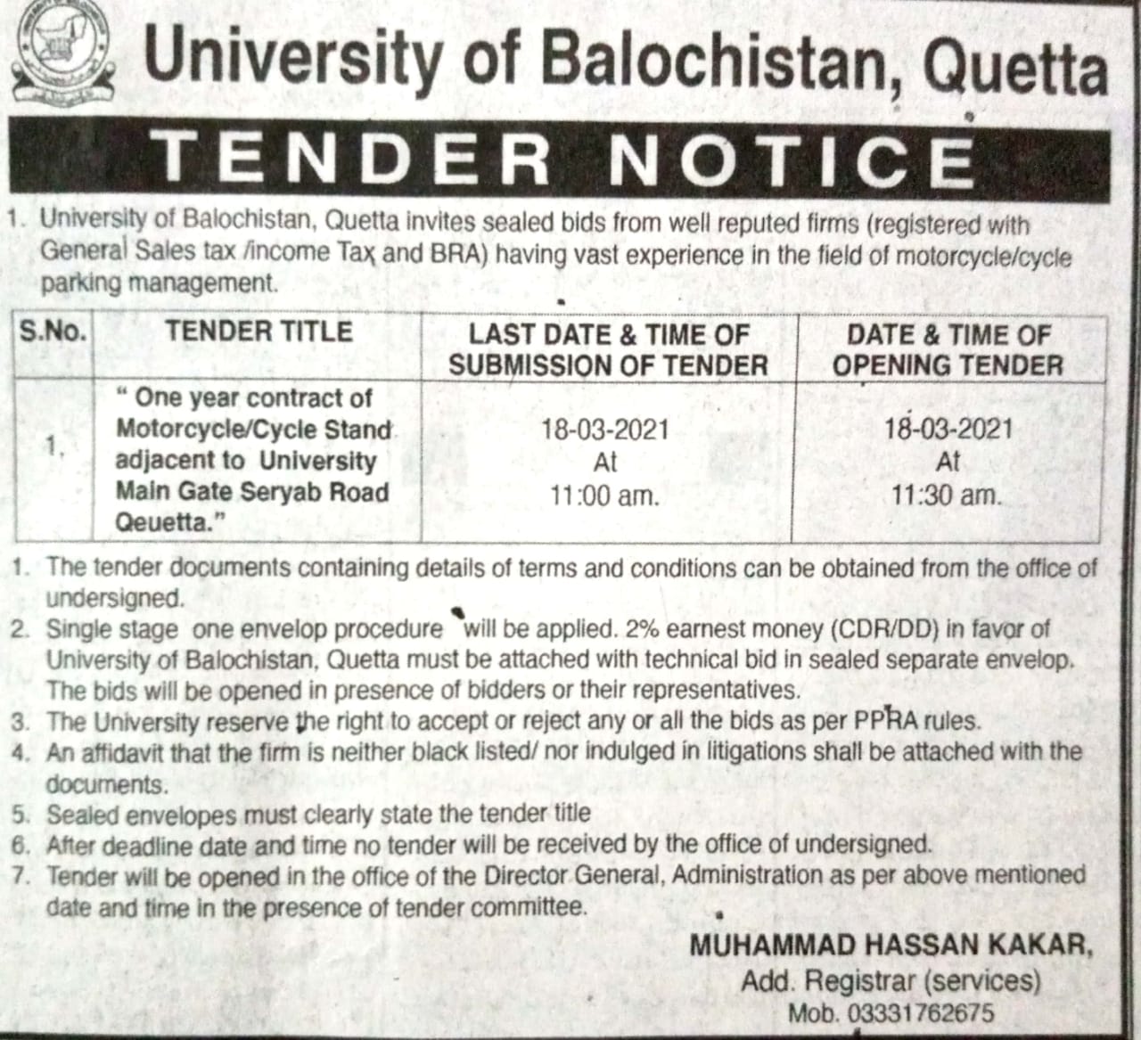 Tender Notice: One year contract of Motorcycle/ Cycle stand adjacent to University main gate.