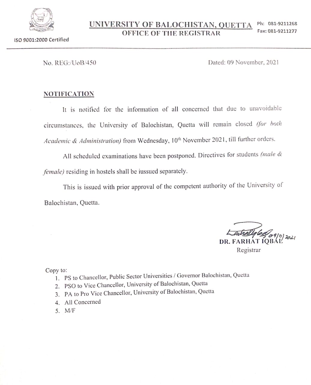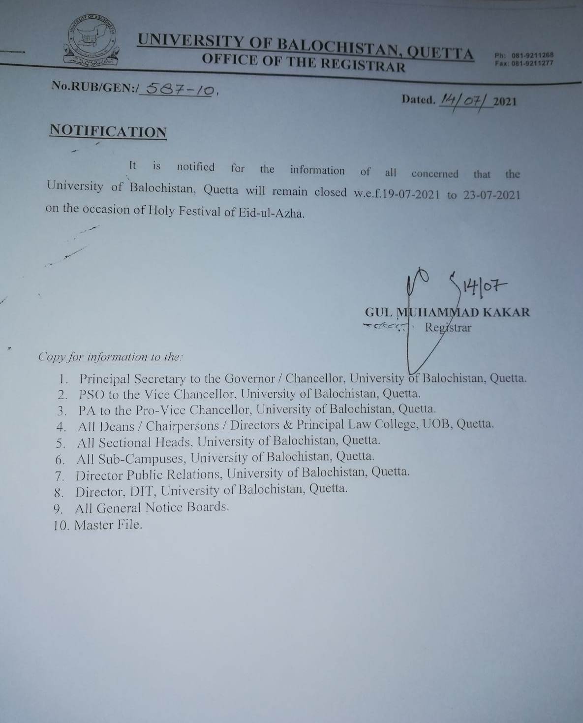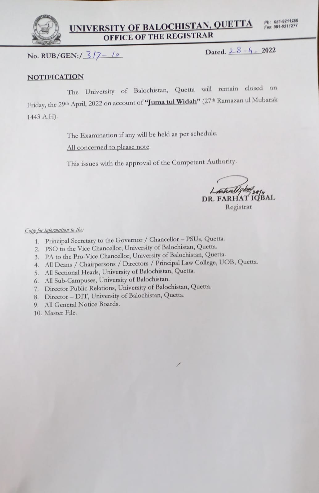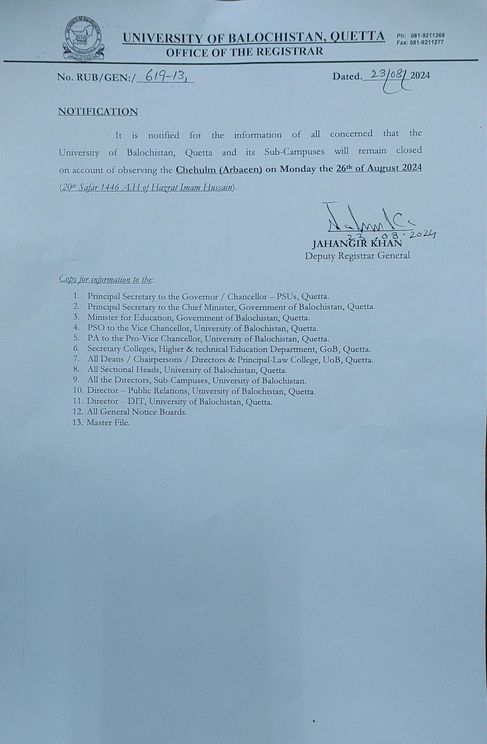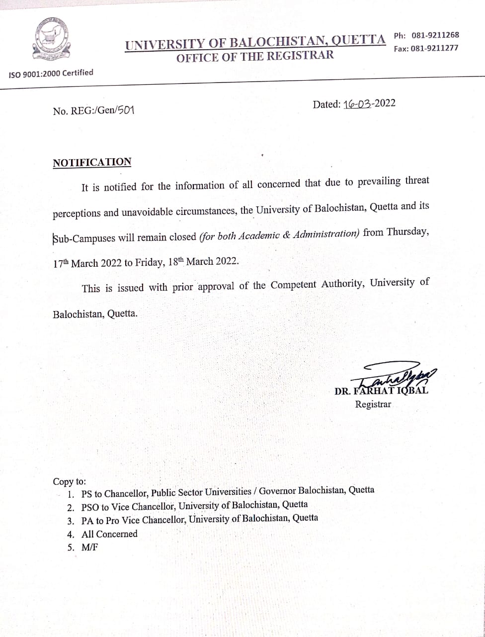 University of Balochistan Quetta & its Sub-Campuses will remain closed on account of