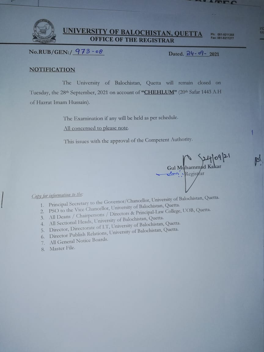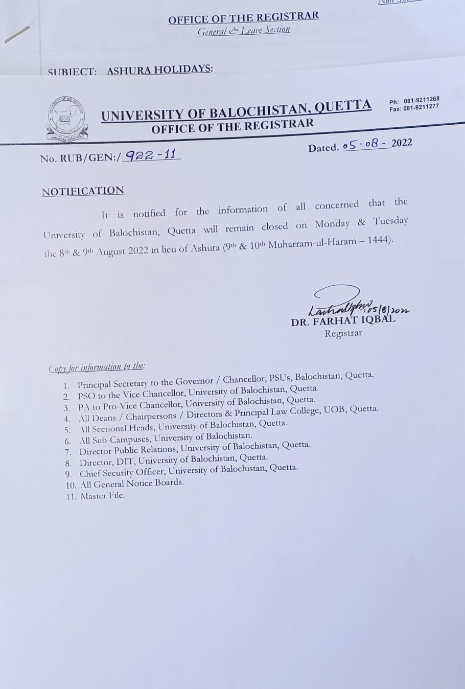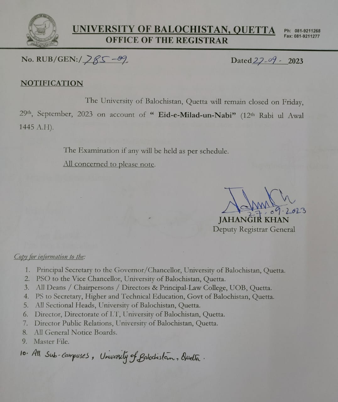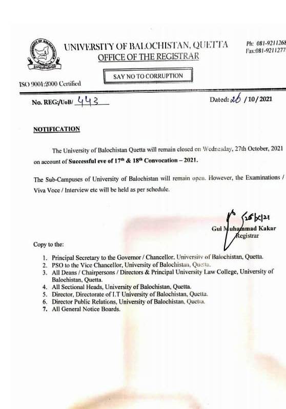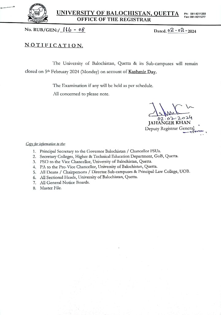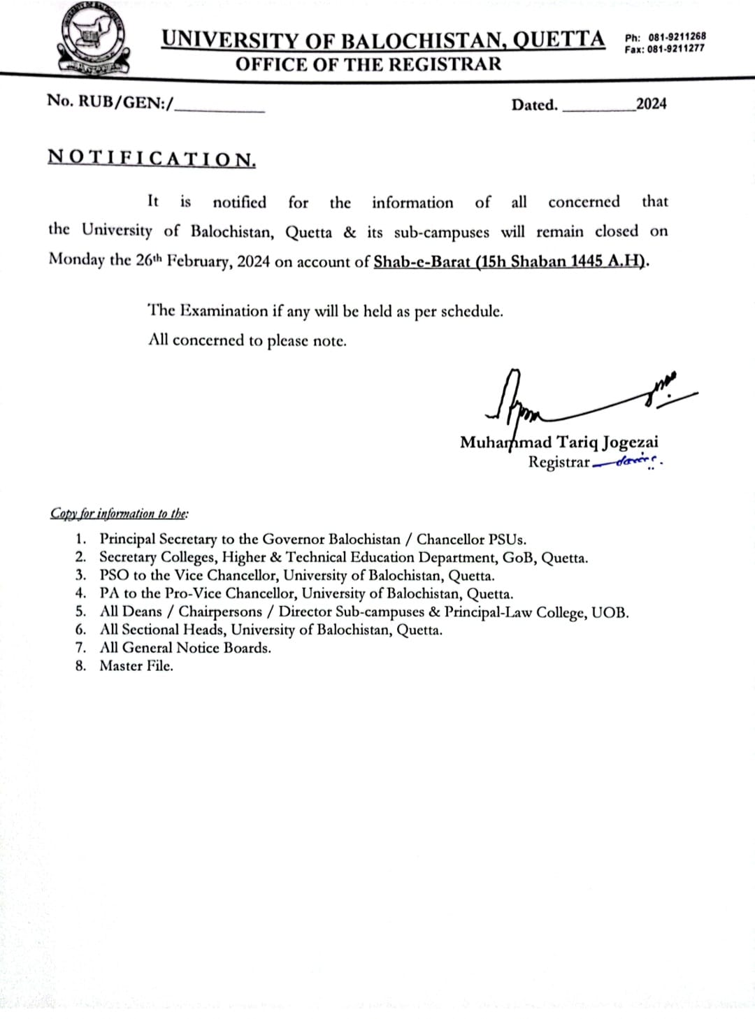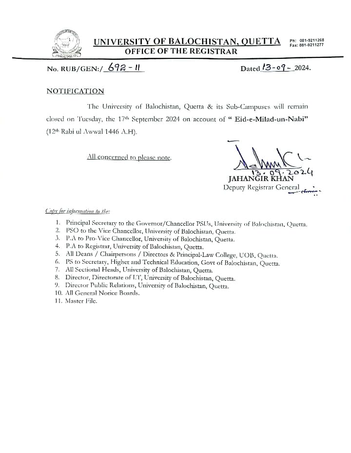 University of Balochistan Quetta & its Sub-Campuses will remain closed on account of