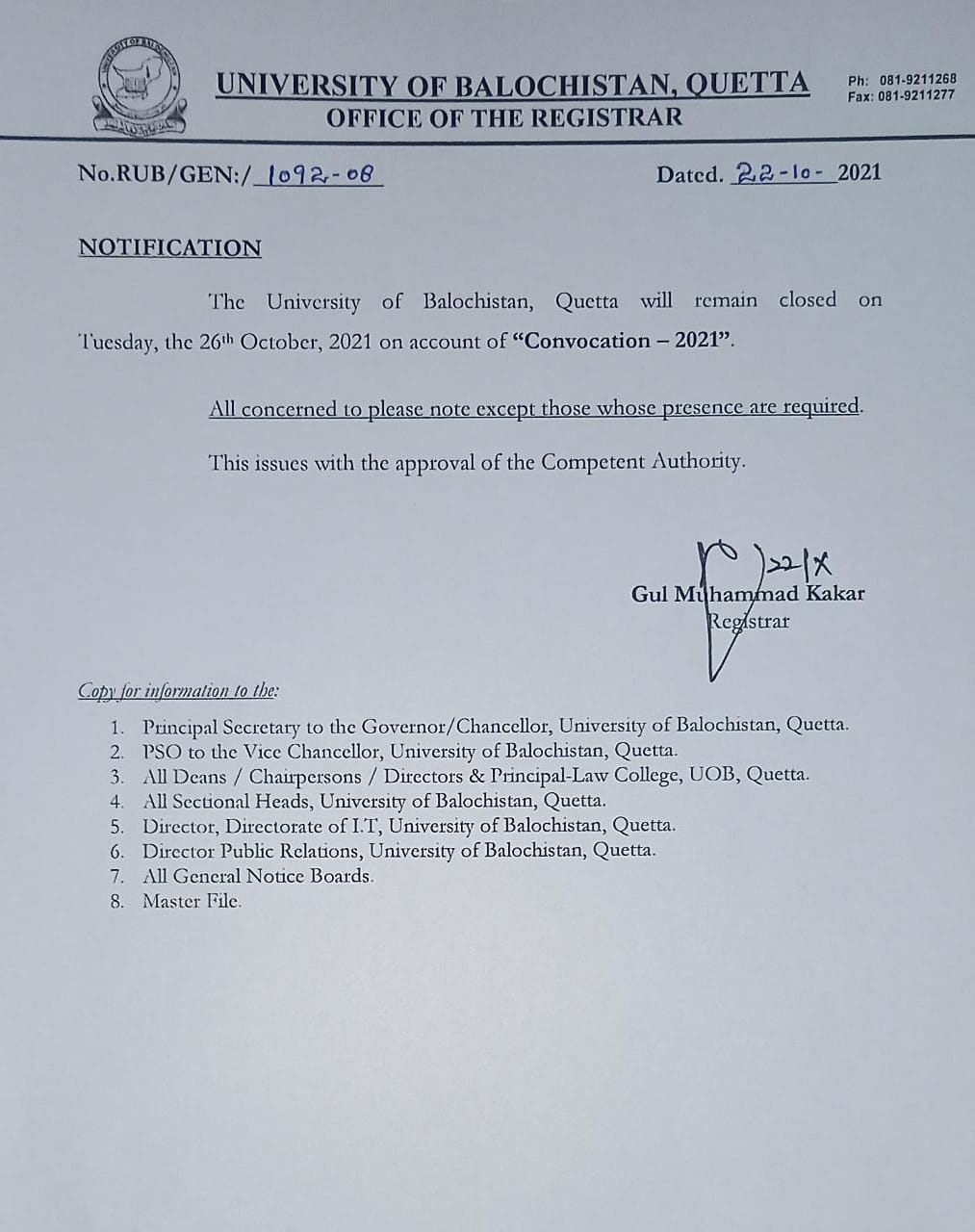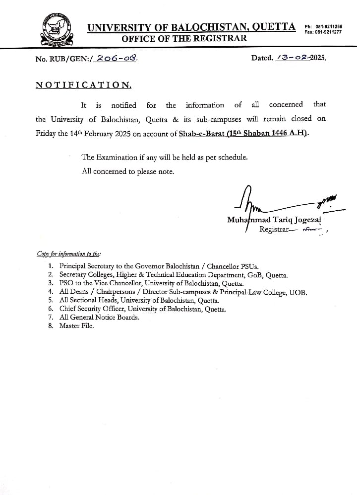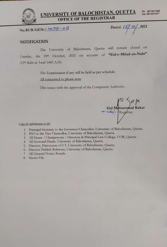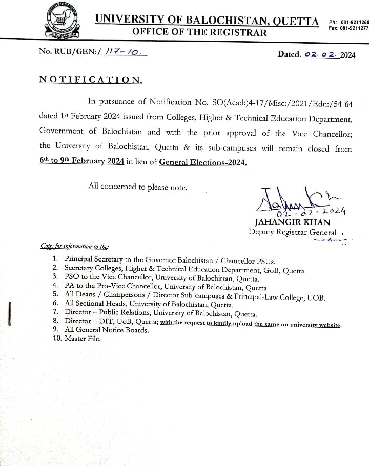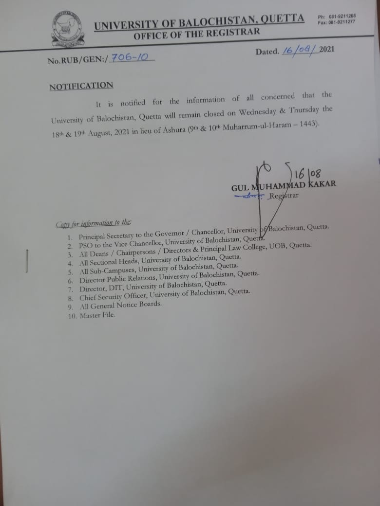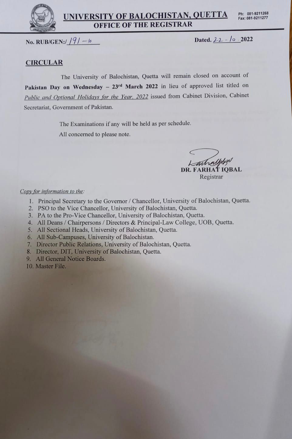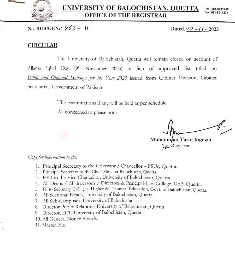 University of Balochistan Quetta & its Sub-Campuses will remain closed on account of